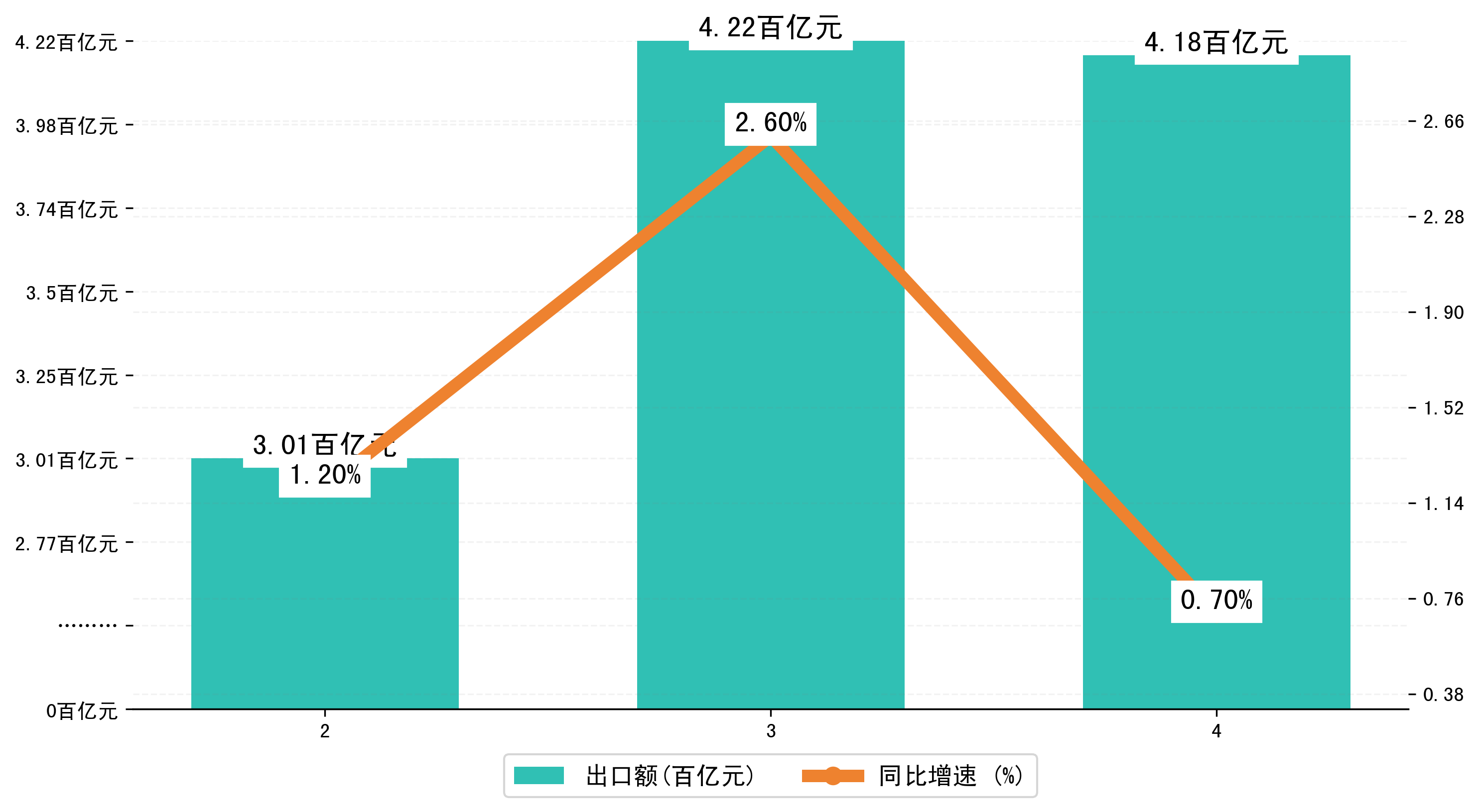 以人民币计,2024年4月重庆市出口额为417,9490.7767万元,相比上月减少了4,2009.7642万元;相比上年同期减少了27,4674.231万元,同比增加了0.70%。