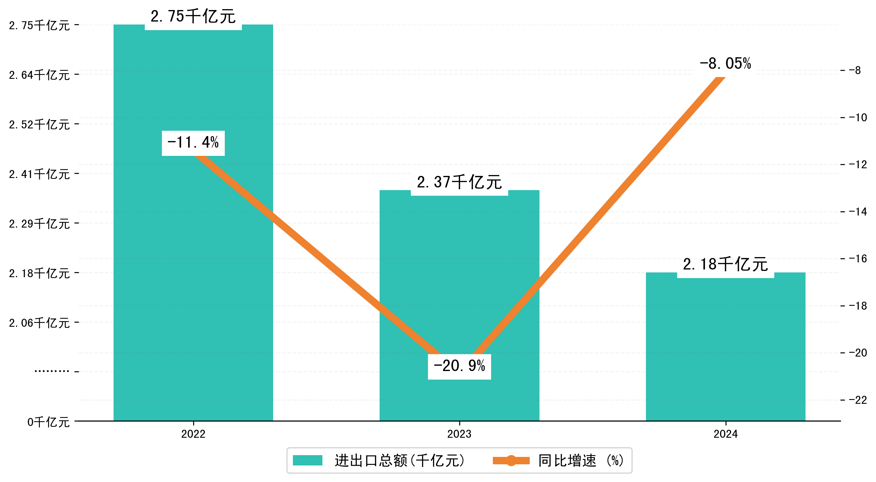 以人民币计,2024年1-4月重庆市进出口总额为2178,7298.1351万元,相比上年同期减少了190,7634.0819万元,同比减少了-5.50%。