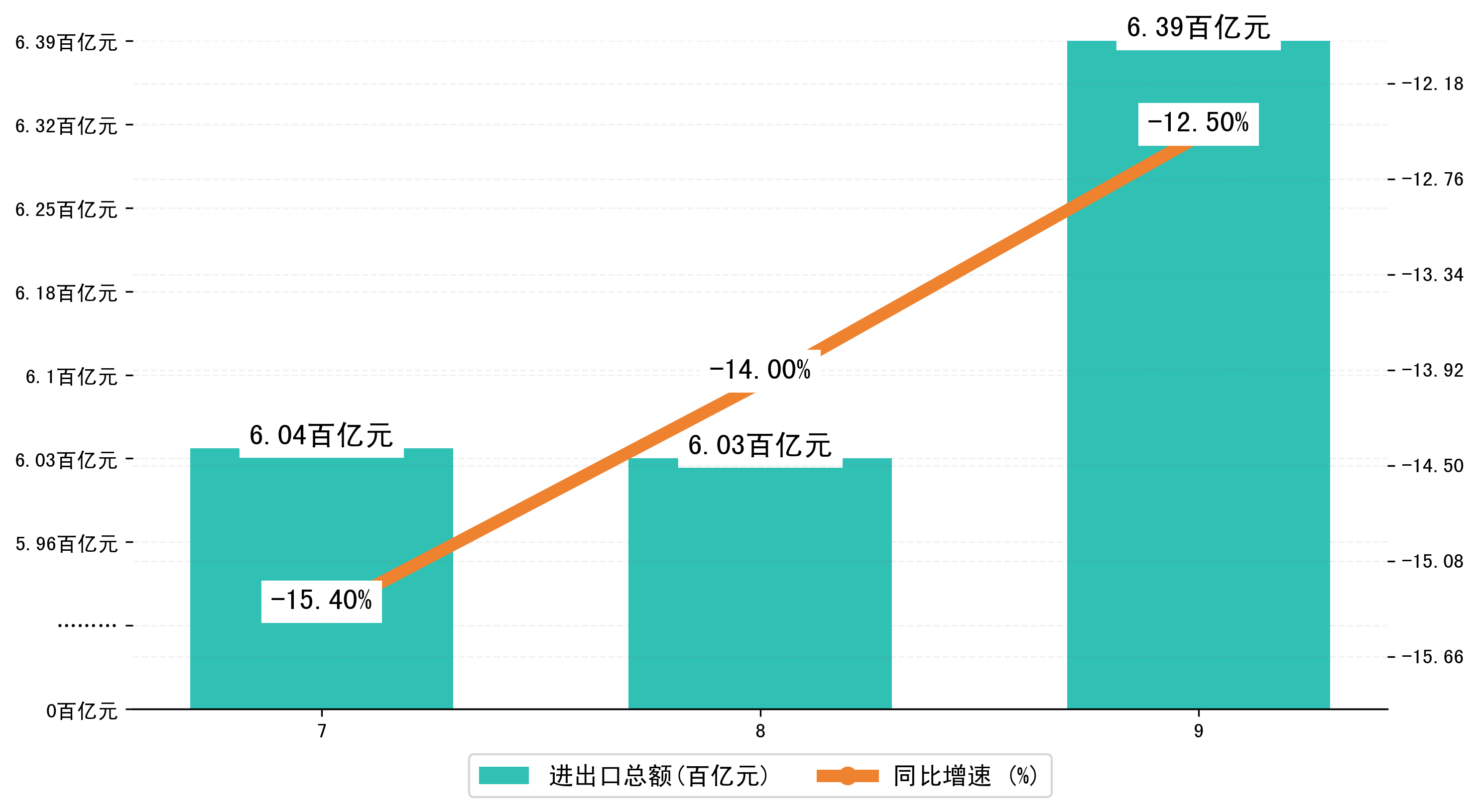 以人民币计,2023年9月重庆市进出口总额为639,3763.3978万元,相比上月增加了36,3478.7719万元;相比上年同期减少了15,3409.3742万元,同比减少了-12.50%。