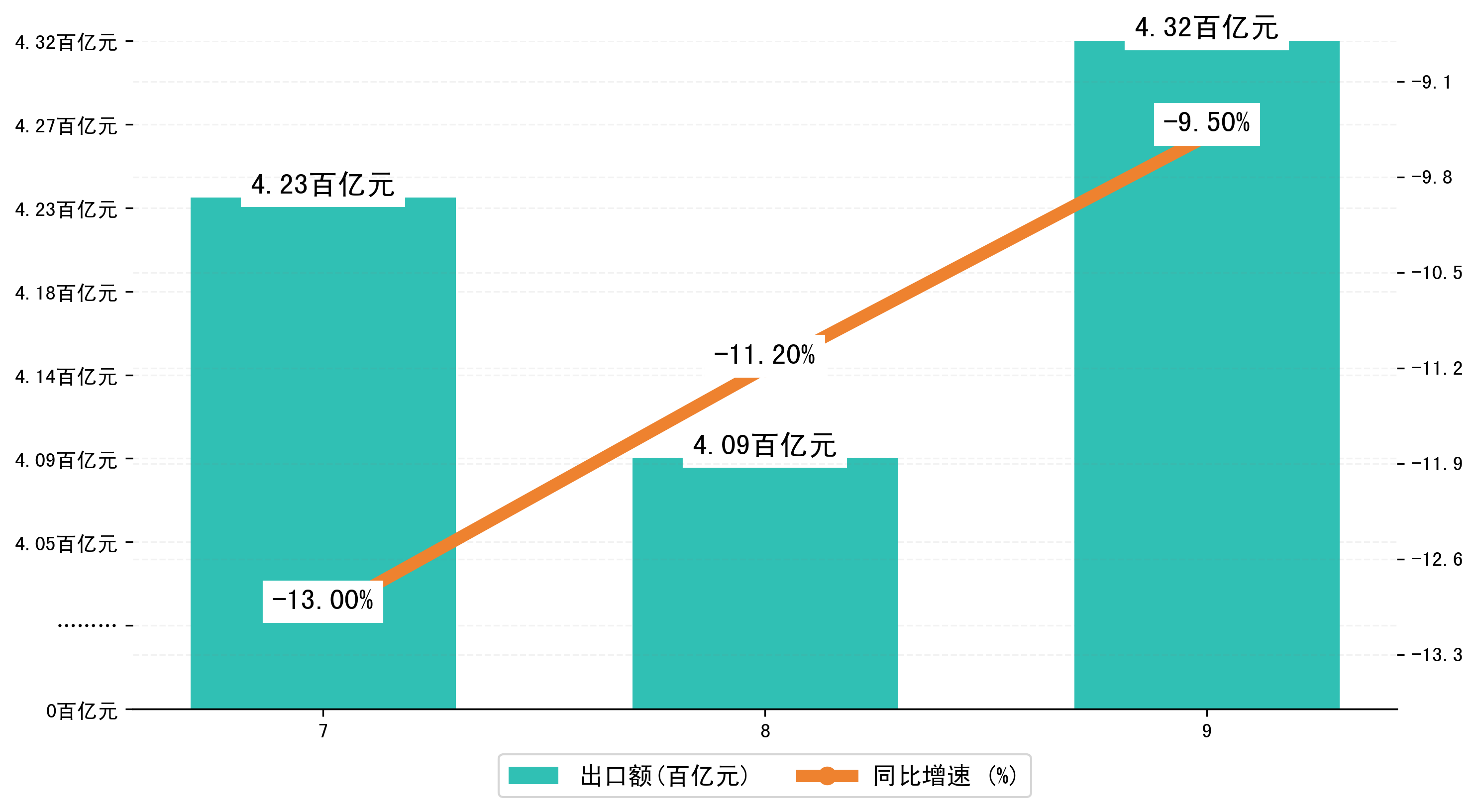 以人民币计,2023年9月重庆市出口额为431,6749.5276万元,相比上月增加了22,5856.5566万元;相比上年同期增加了10,7773.9211万元,同比减少了-9.50%。