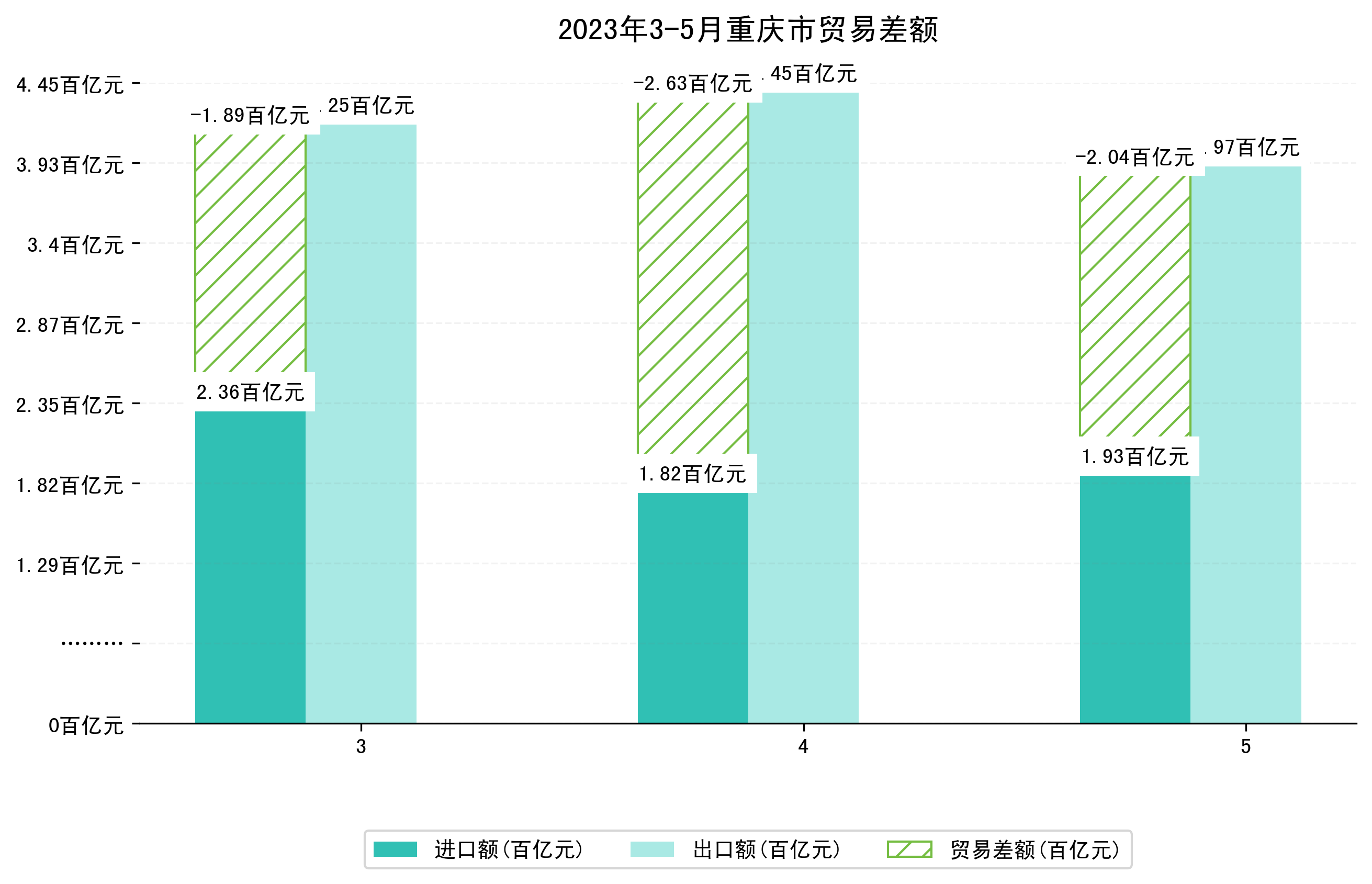以人民币计,2023年5月重庆市贸易差额为203,7526,5391万元(贸易顺差),相比上月减少了59,6623,5665万元,即8,8103,7867万美元;相比上年同期增加了32,4981,7403万元,同比增加18.98%。