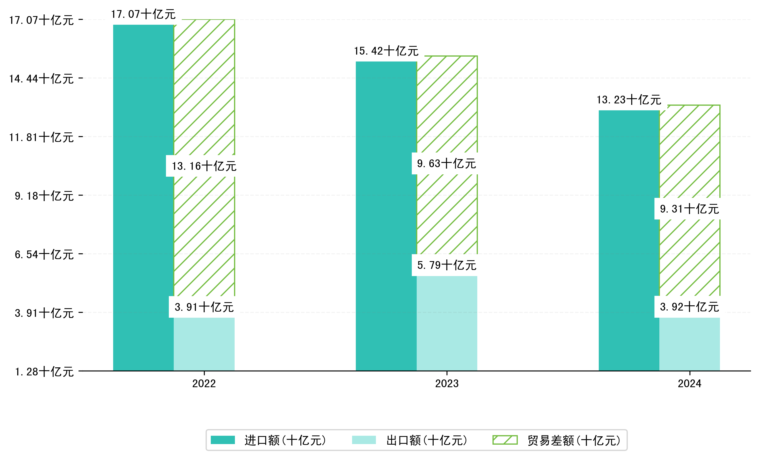 以人民币计,2024年1-4月甘肃省贸易差额为93,0722,6116万元(贸易逆差),相比上年同期增加了3,2361,1357万元,同比增加-3.36%。