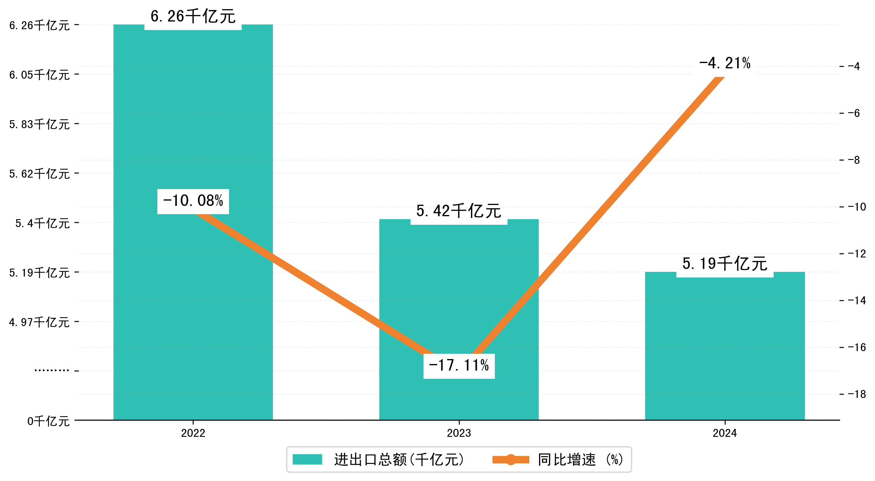 以人民币计,2024年1-9月重庆市进出口总额为5188,4740.143万元,相比上年同期减少了227,8743.8136万元,同比减少了-2.50%。