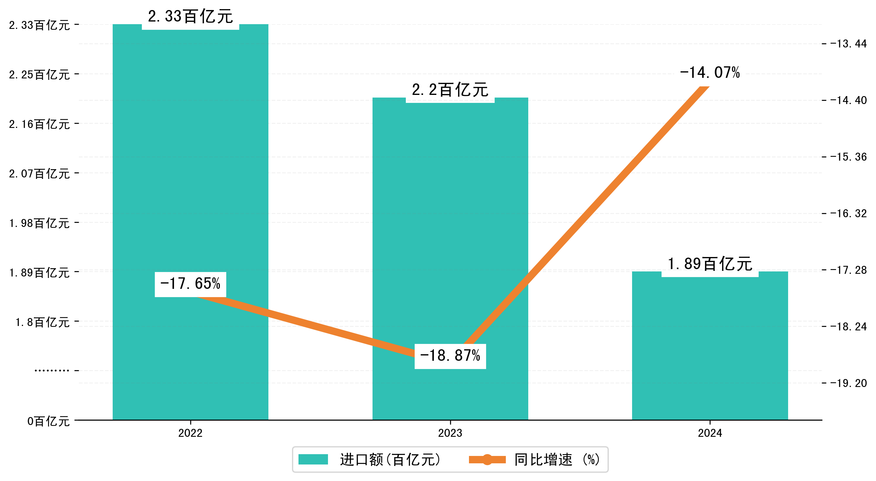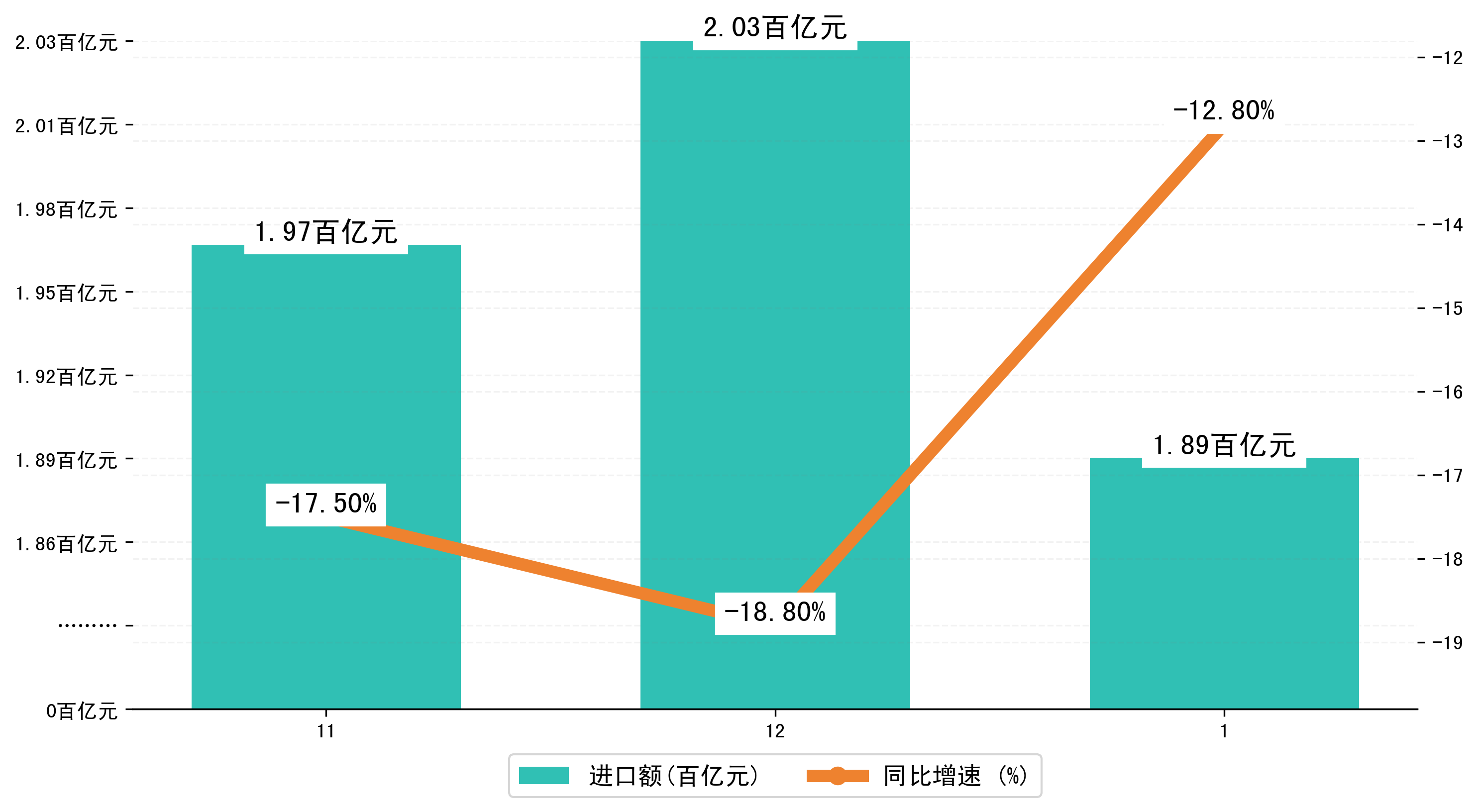 以人民币计,2024年1-1月重庆市进口额为189,2861.8841万元,相比上年同期减少了30,9823.5921万元,同比减少了-12.80%。