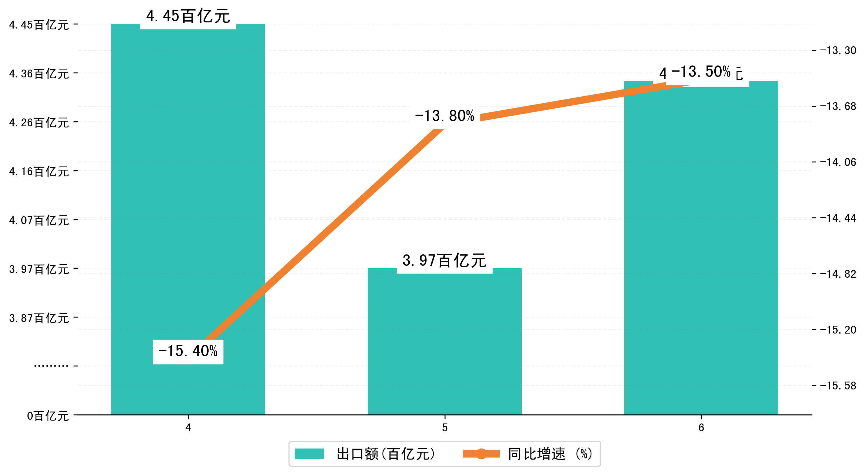 以美元计,2023年1-6月重庆市出口额为345,4628.2528万美元,相比上年同期减少了85,6101.1869万美元,同比减少-19.20%。