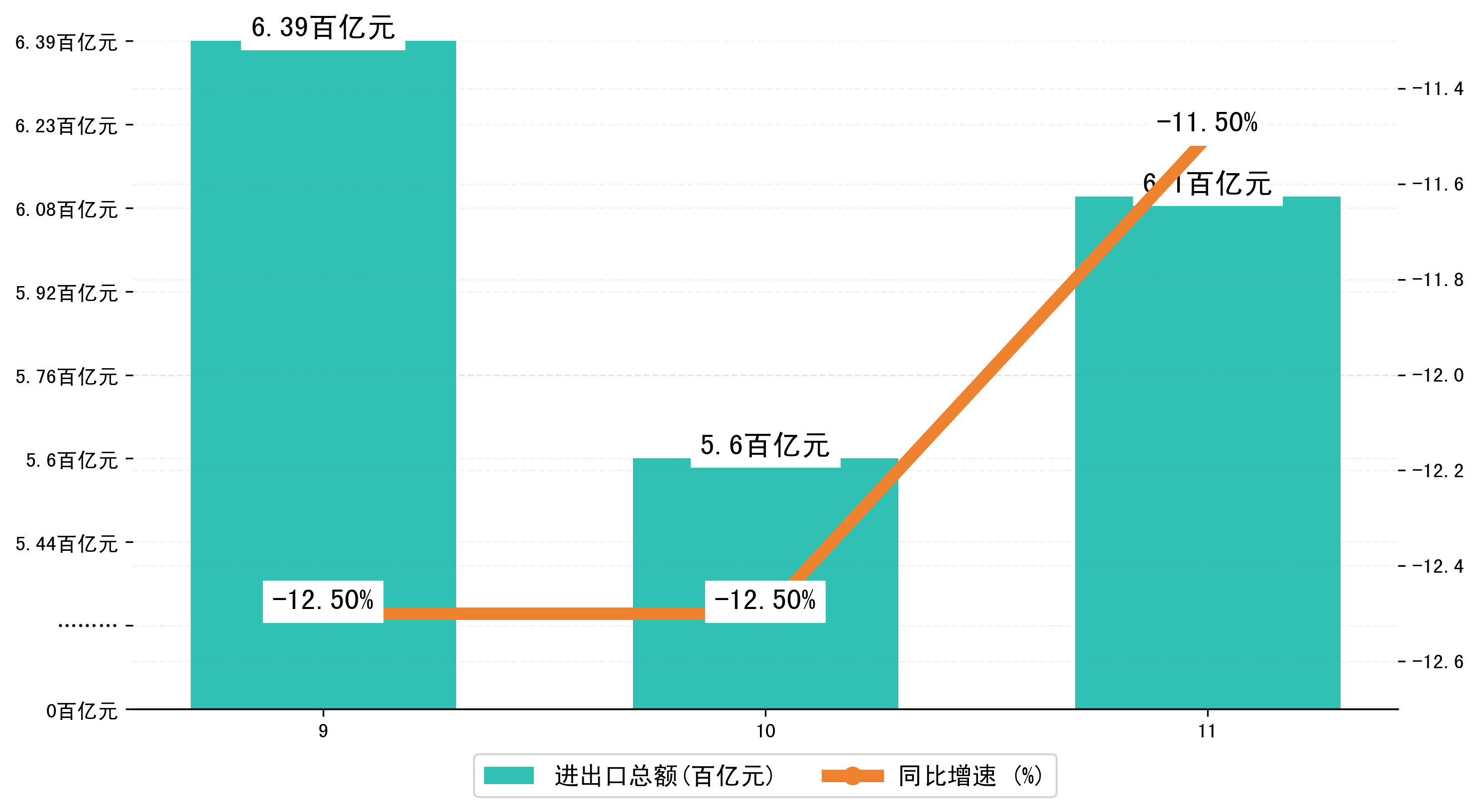 以人民币计,2023年11月重庆市进出口总额为609,7148.2187万元,相比上月增加了49,8367.8441万元;相比上年同期增加了16,5169.3722万元,同比减少了-11.50%。