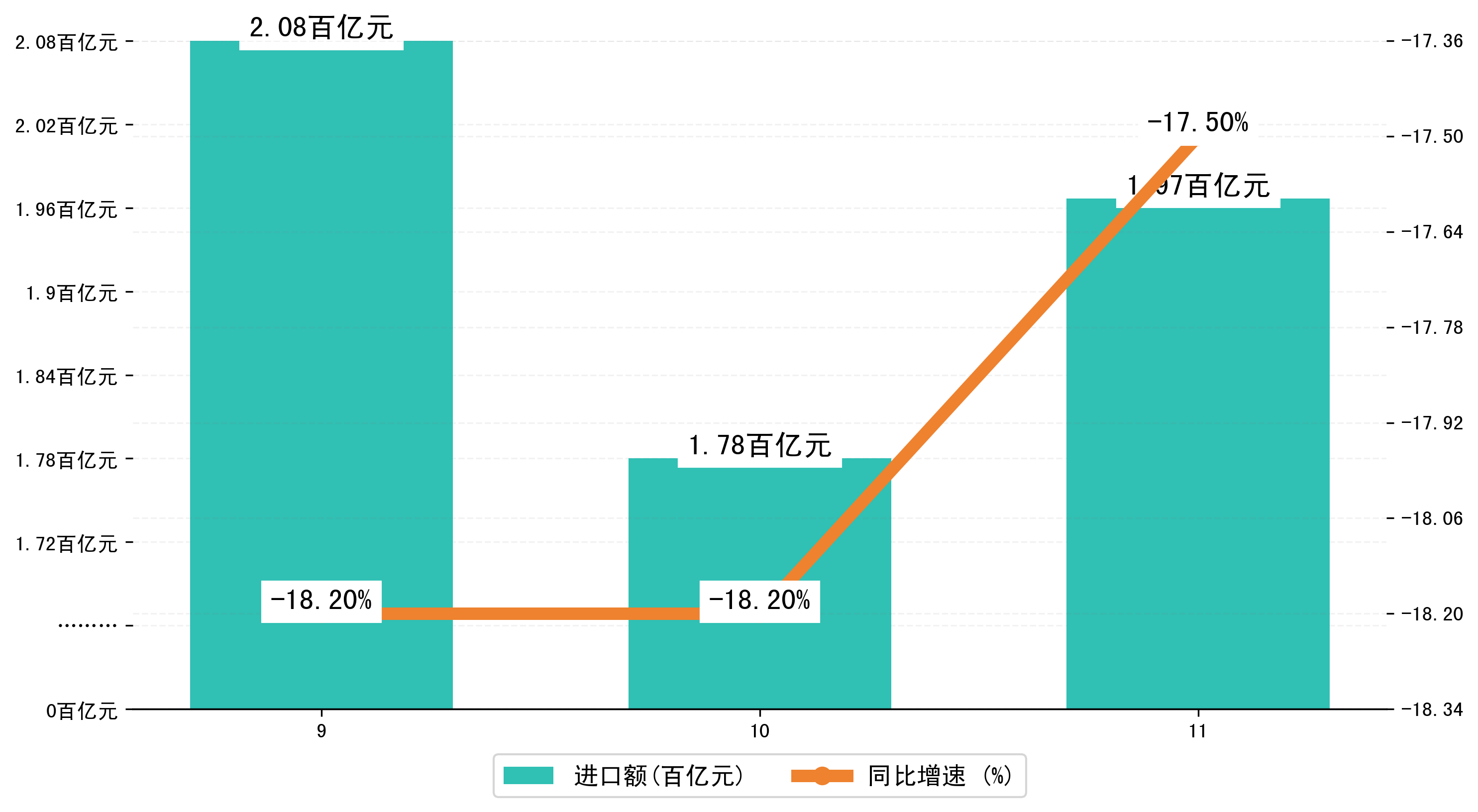 以人民币计,2023年1-11月重庆市进口额为2152,0424.4905万元,相比上年同期减少了465,2007.3431万元,同比减少了-17.50%。