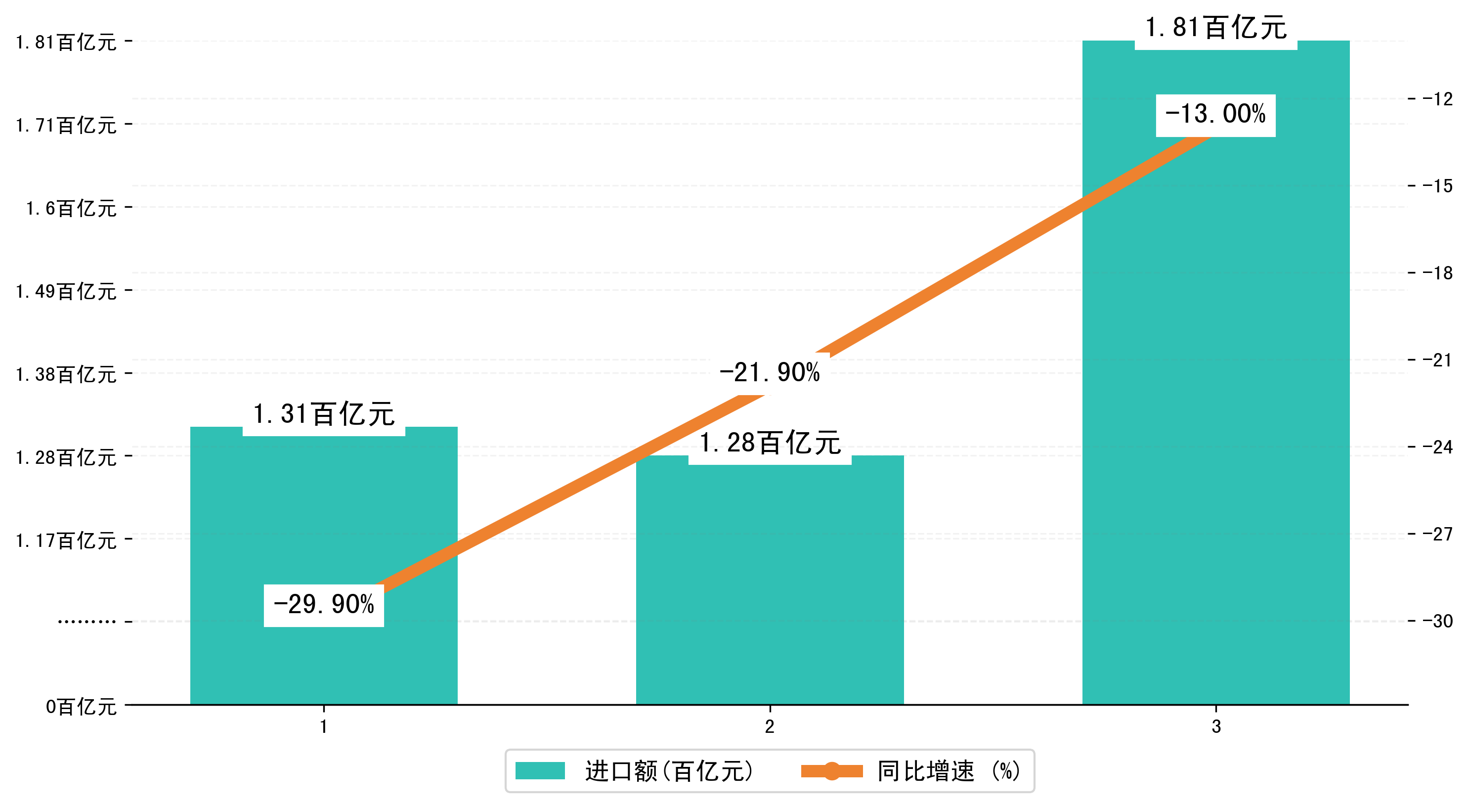 以人民币计,2025年3月重庆市进口额为181,4900.9737万元,相比上月增加了53,8712.1278万元;相比上年同期增加了6,6008.2634万元,同比减少了-13.00%。