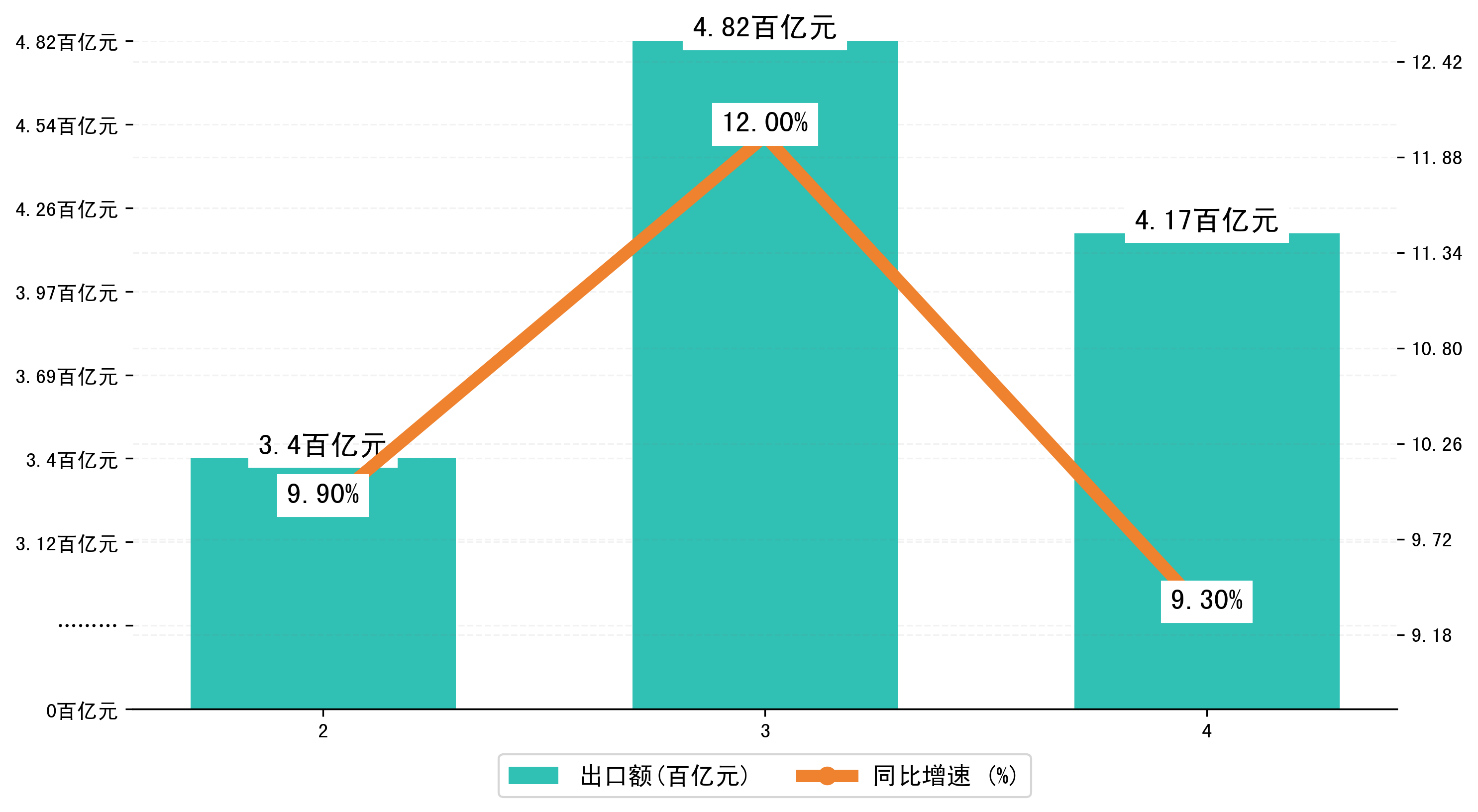 以人民币计,2025年4月重庆市出口额为416,8549.9343万元,相比上月减少了65,5097.3131万元;相比上年同期减少了1,0940.8424万元,同比增加了9.30%。