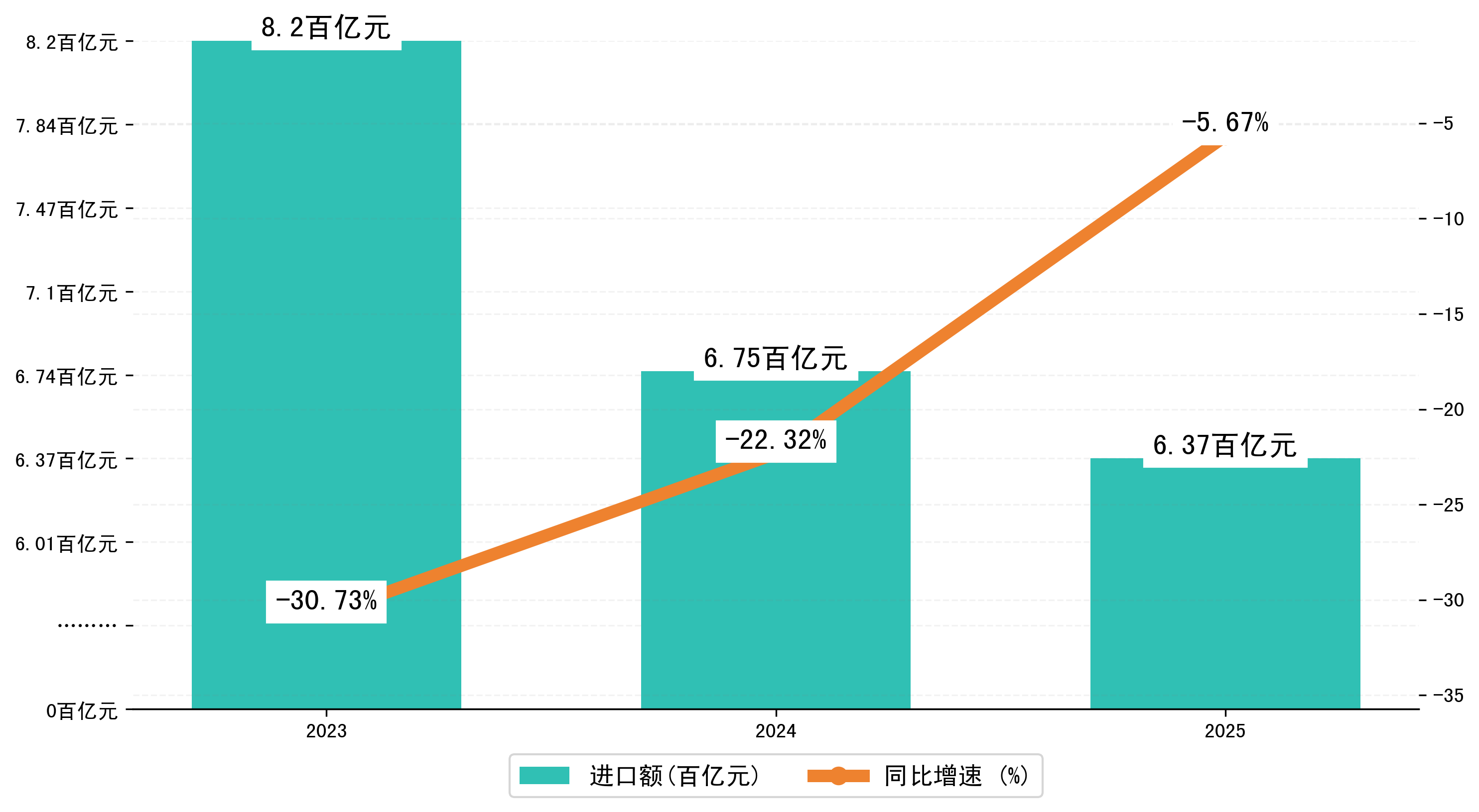 以美元计,2025年1-4月重庆市进口额为88,7788.2028万美元,相比上年同期减少了6,3154.6153万美元,同比减少-6.40%。