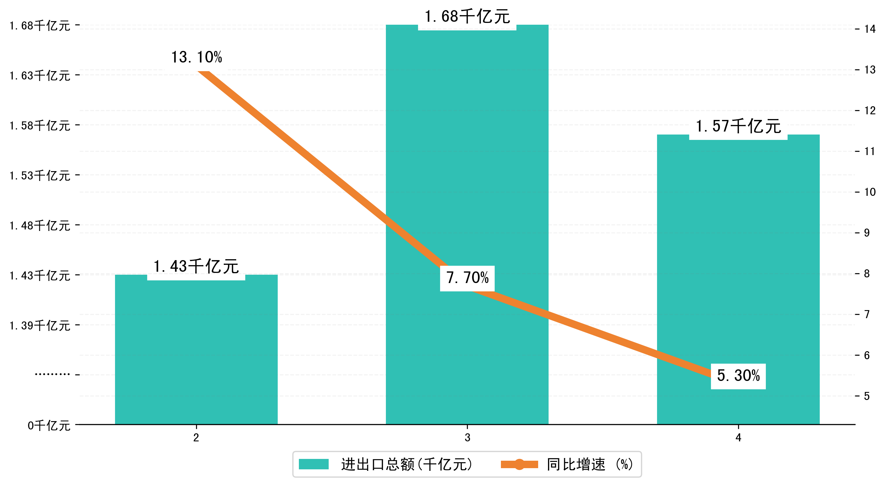 以人民币计,2024年4月福建省进出口总额为1570,5751.0871万元,相比上月减少了106,5030.239万元;相比上年同期减少了30,7634.733万元,同比增加了5.30%。