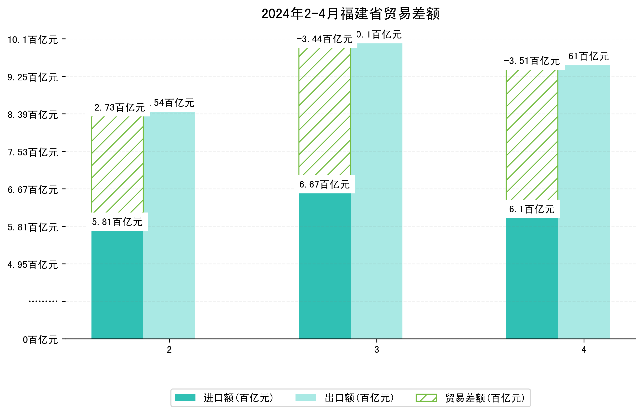 以美元计,2024年1-4月福建省贸易差额为210,4841,8542万美元(贸易顺差),相比上年同期增加了35,7621,3497万美元,同比增加20.47%。
