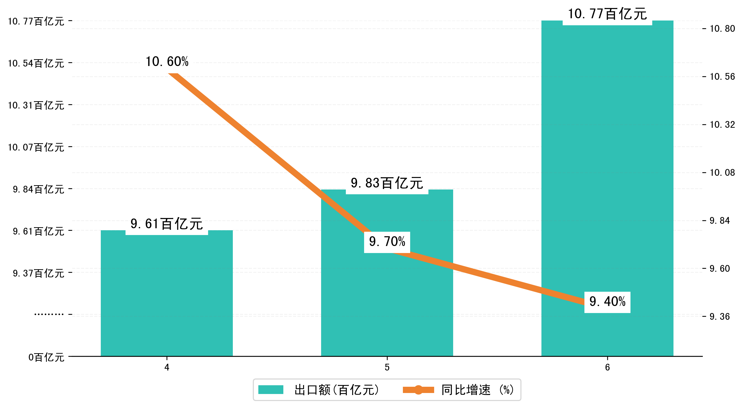 以人民币计,2024年6月福建省出口额为1077,2230.4594万元,相比上月增加了93,9823.5098万元;相比上年同期增加了76,7566.5981万元,同比增加了9.40%。