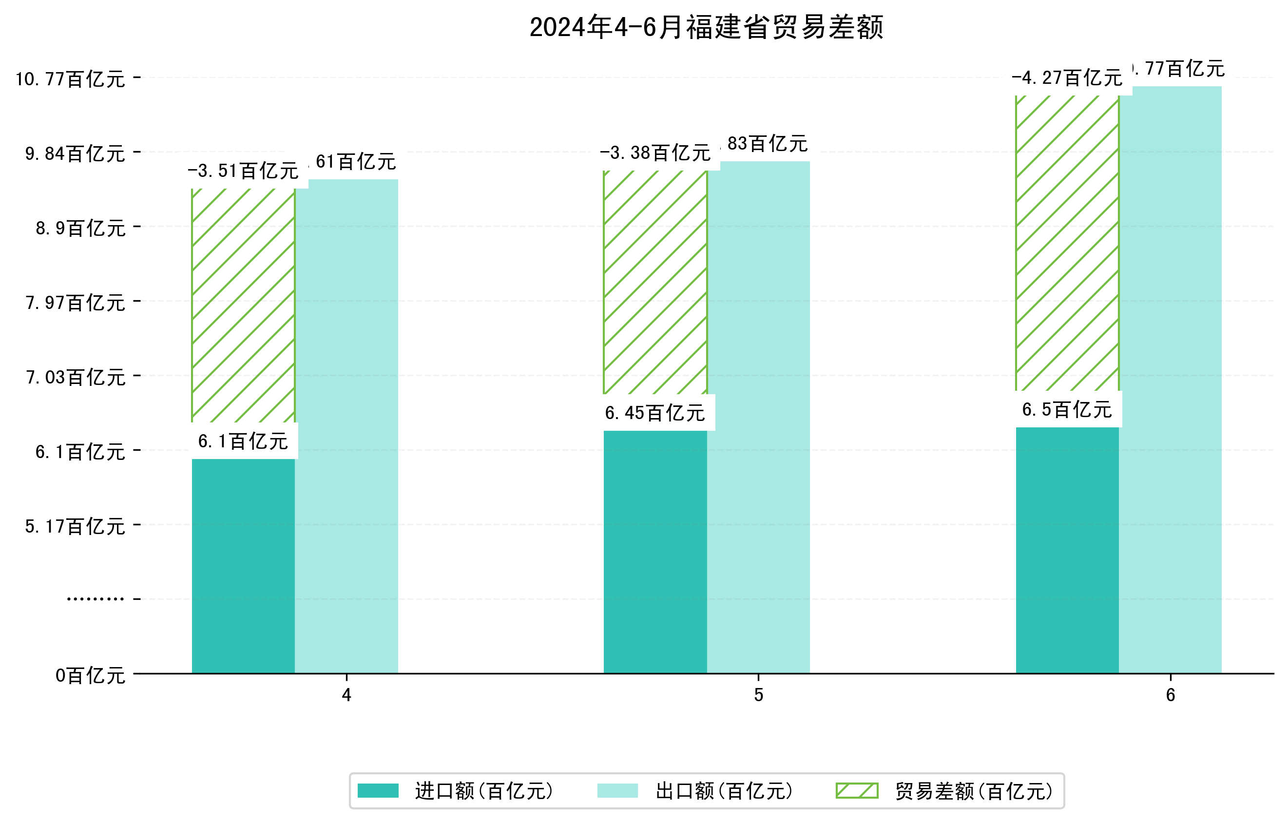 以美元计,2024年1-6月福建省贸易差额为318,5639,7113万美元(贸易顺差),相比上年同期增加了79,7113,2317万美元,同比增加33.37%。