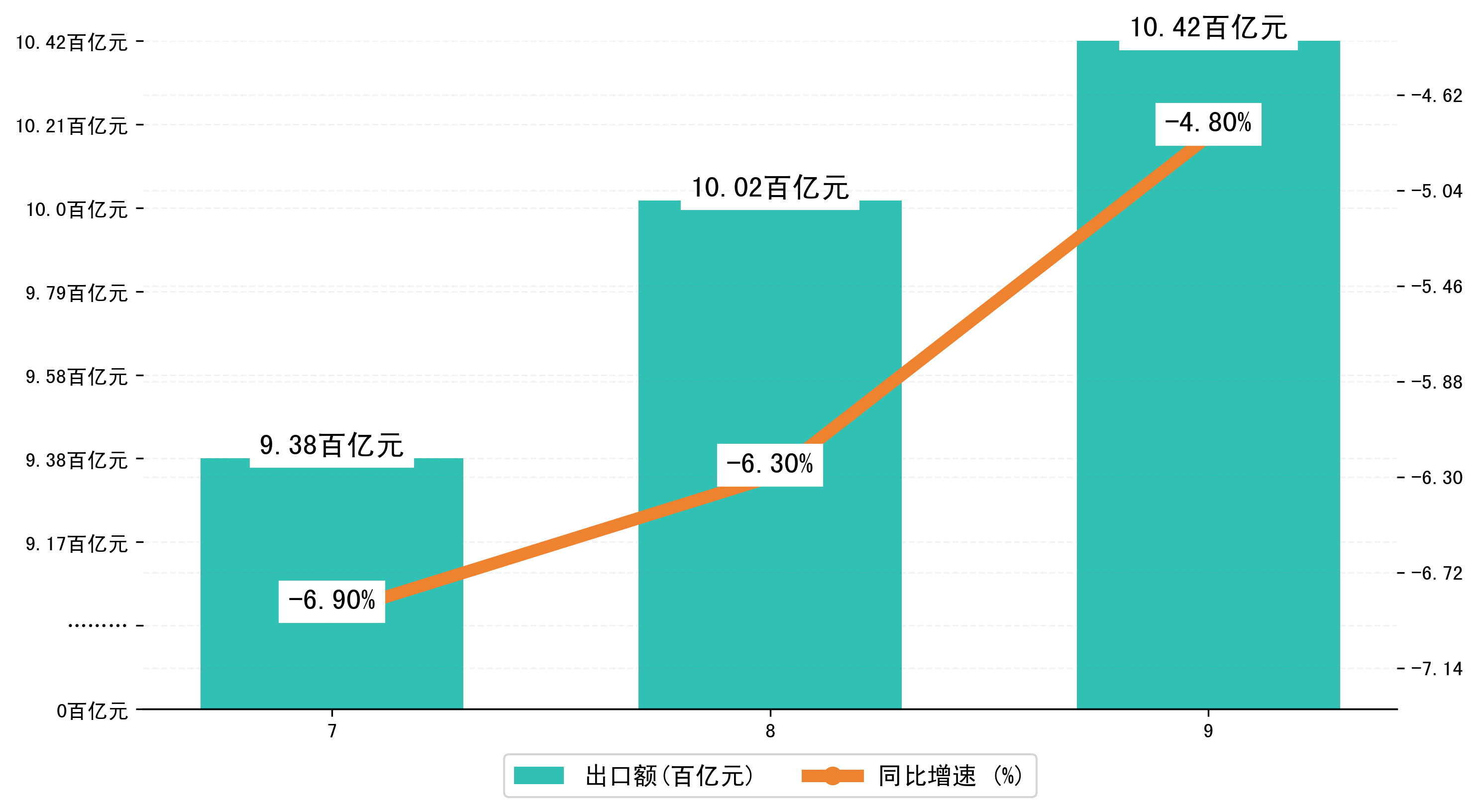 以人民币计,2023年9月福建省出口额为1042,3891.7994万元,相比上月增加了40,1598.3953万元;相比上年同期增加了71,8793.9389万元,同比减少了-4.80%。