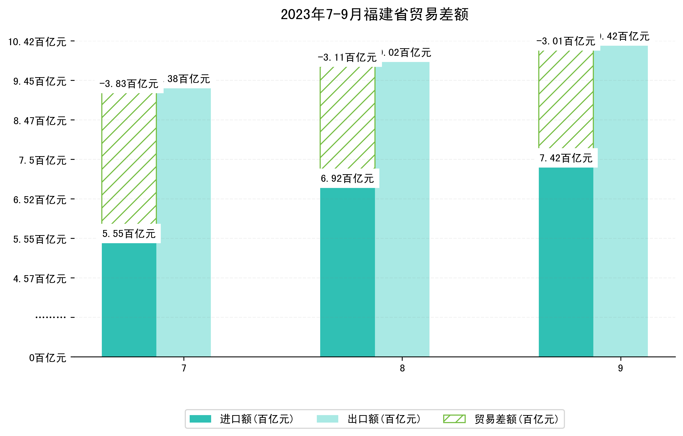 以人民币计,2023年9月福建省贸易差额为300,7236,9389万元(贸易顺差),相比上月减少了9,9897,0874万元,即1,7507,1337万美元;相比上年同期增加了11,8842,3565万元,同比增加4.11%。