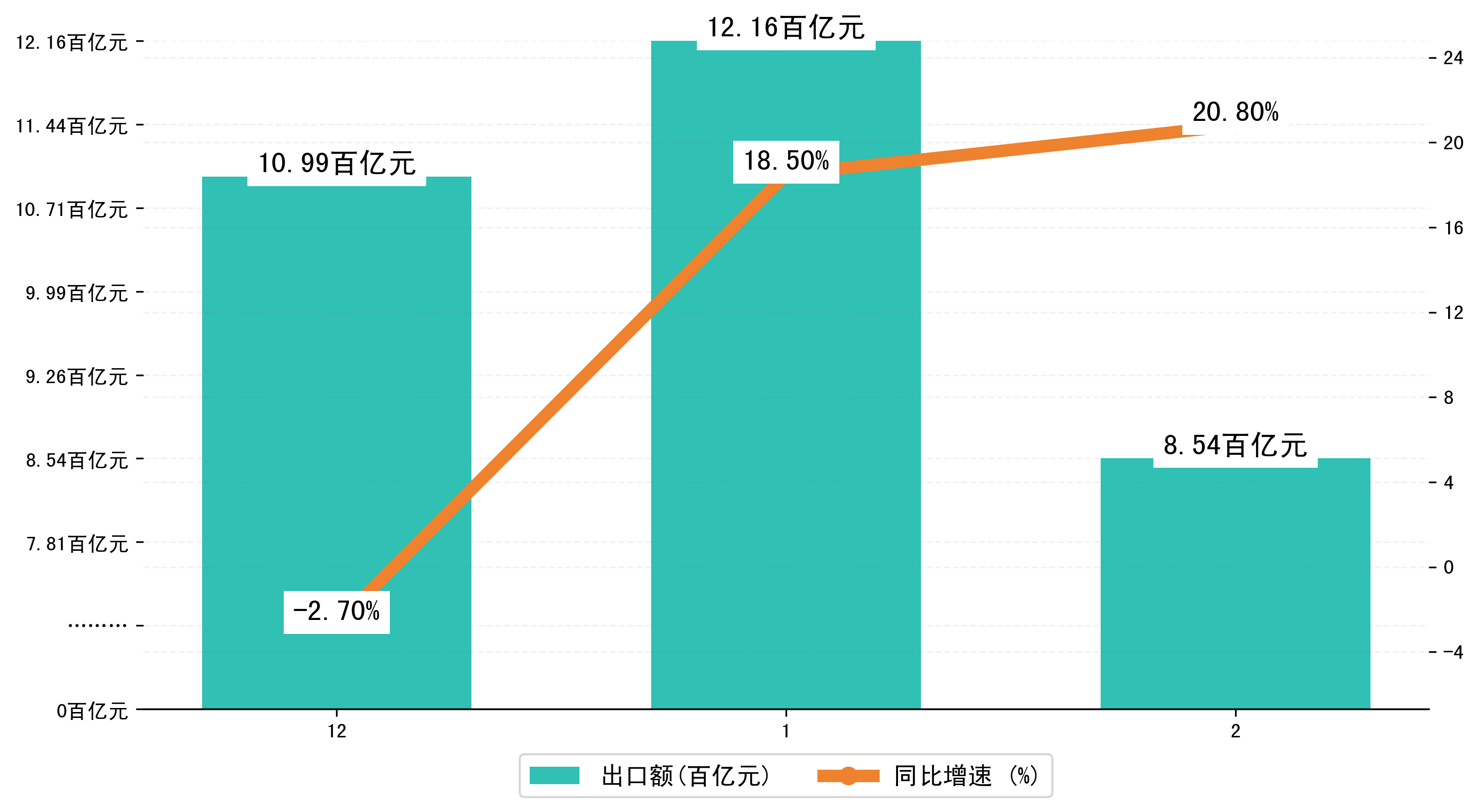 以美元计,2024年2月福建省出口额为120,0998.1397万美元,相比上月减少了51,1214.7841万美元;相比上年同期增加了13,4725.6621万美元,同比增加17.30%。