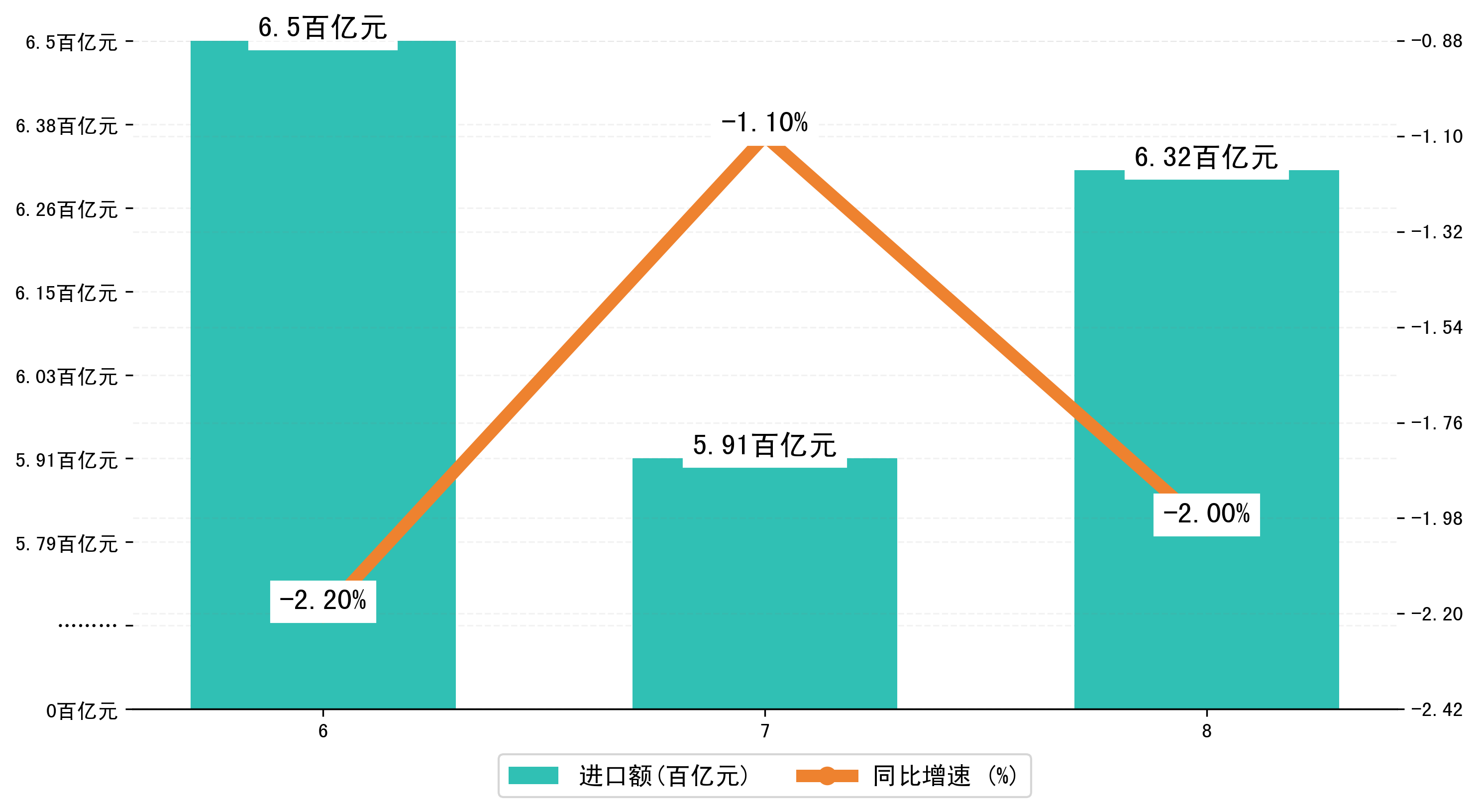 以美元计,2024年8月福建省进口额为88,5809.8452万美元,相比上月增加了5,5269.5521万美元;相比上年同期减少了7,9832.4323万美元,同比减少-4.30%。