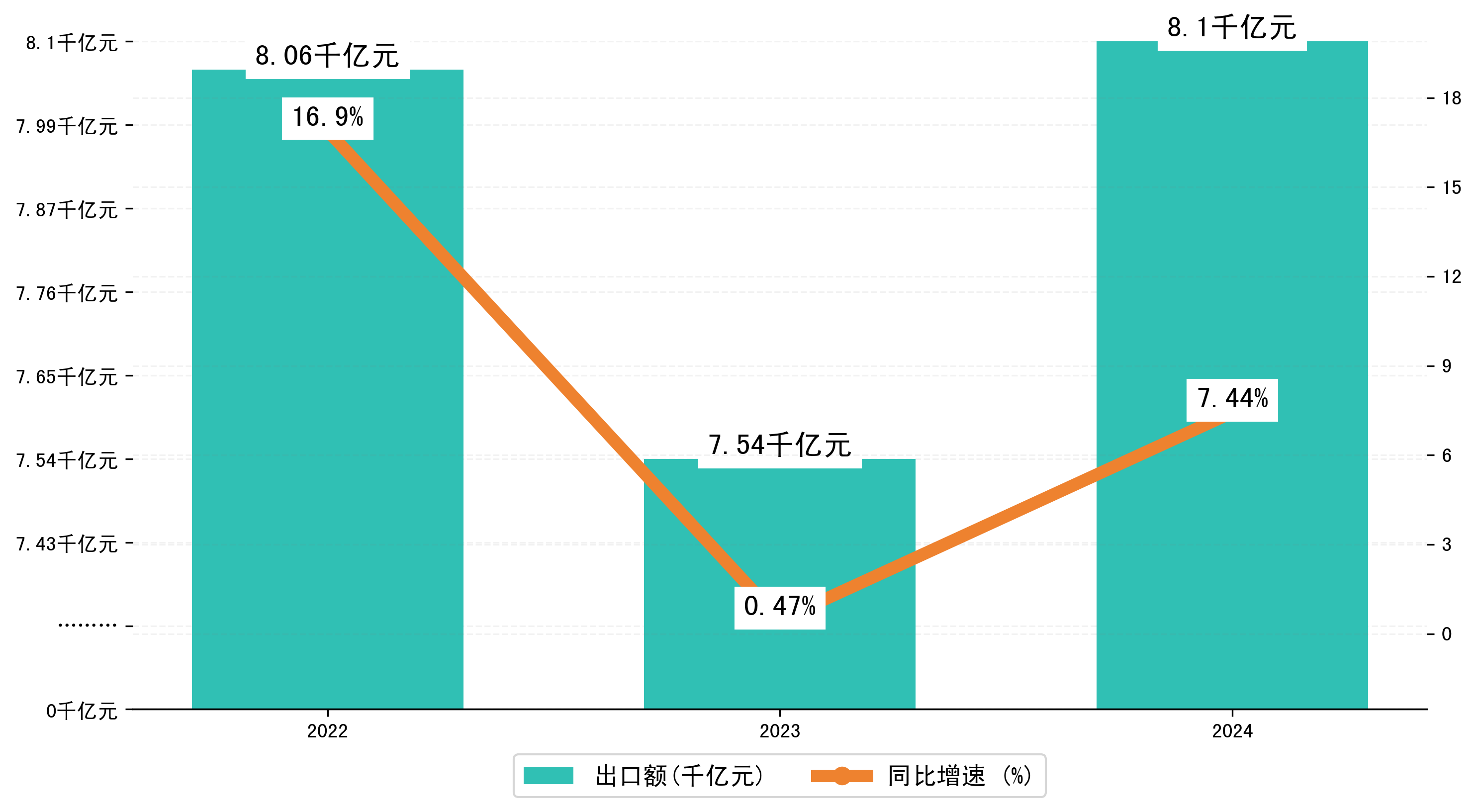 以人民币计,2024年1-8月福建省出口额为8099,1258.047万元,相比上年同期增加了560,6725.0098万元,同比增加了7.80%。