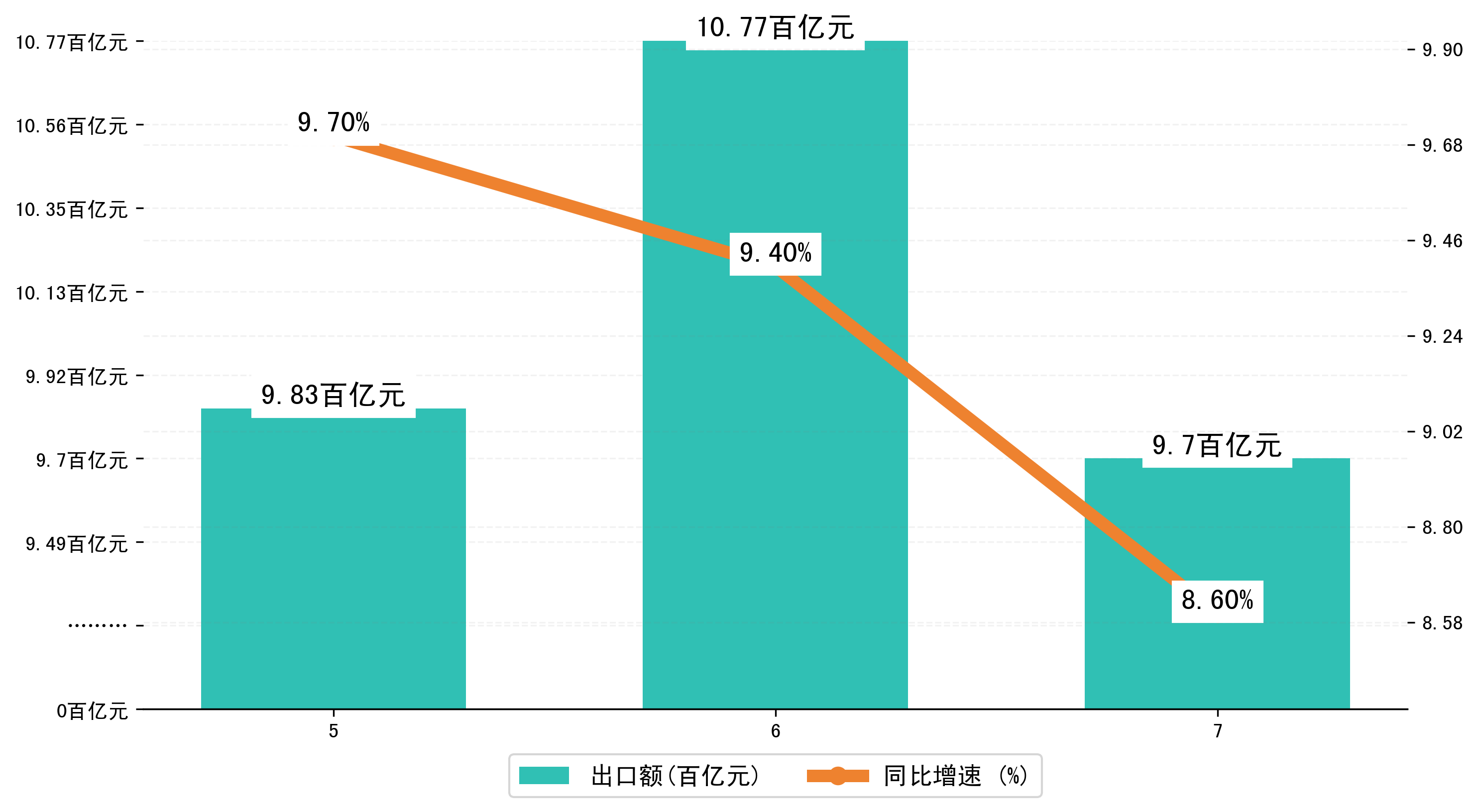 以人民币计,2024年7月福建省出口额为970,4217.9807万元,相比上月减少了106,8012.4787万元;相比上年同期增加了32,9211.0403万元,同比增加了8.60%。