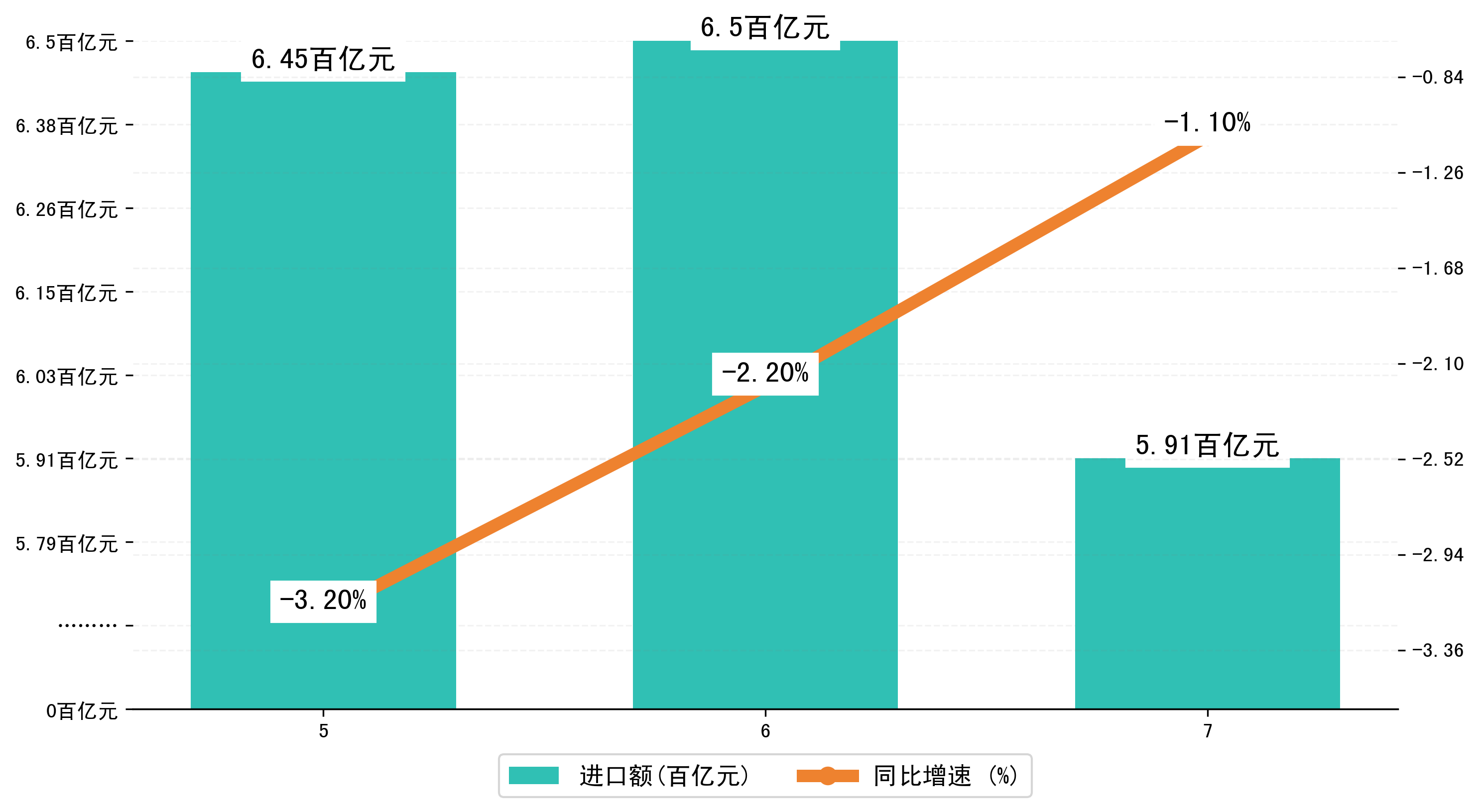 以人民币计,2024年7月福建省进口额为591,0722.0438万元,相比上月减少了58,6927.6629万元;相比上年同期增加了36,1577.2858万元,同比减少了-1.10%。
