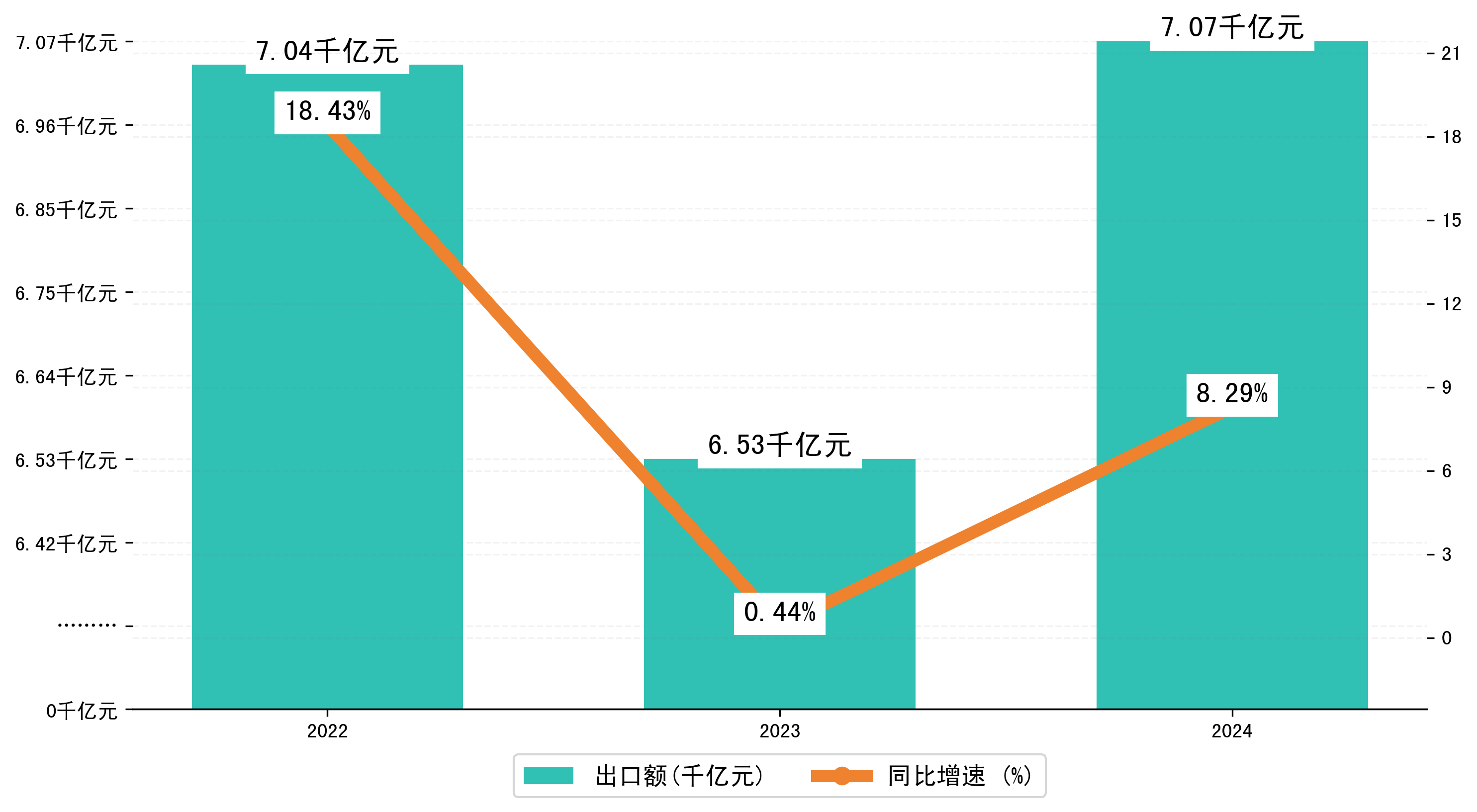 以人民币计,2024年1-7月福建省出口额为7070,6037.6517万元,相比上年同期增加了541,2348.146万元,同比增加了8.60%。