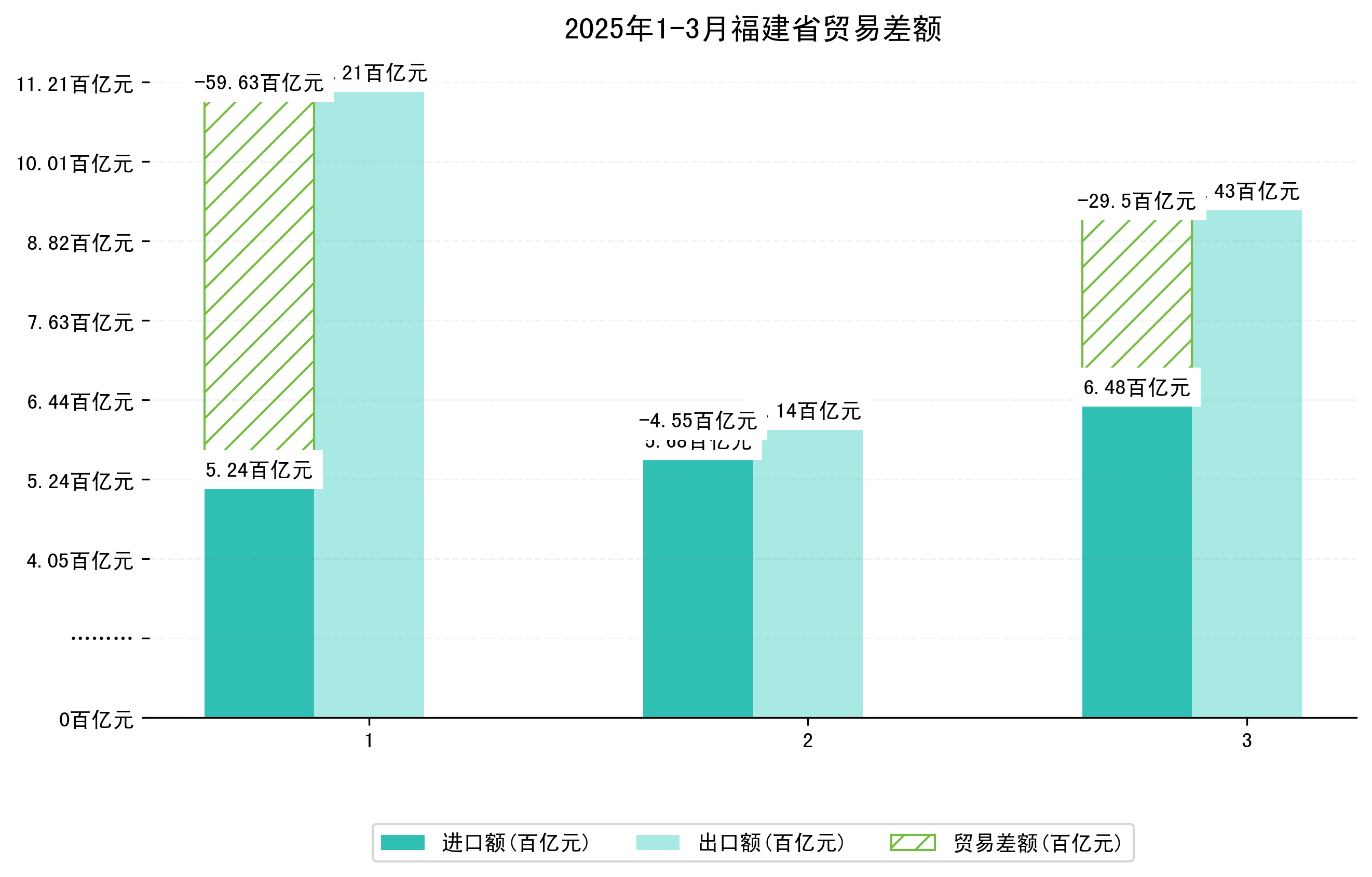 以美元计,2025年1-3月福建省贸易差额为130,3598,9706万美元(贸易顺差),相比上年同期减少了30,4927,2200万美元,同比减少-18.96%。
