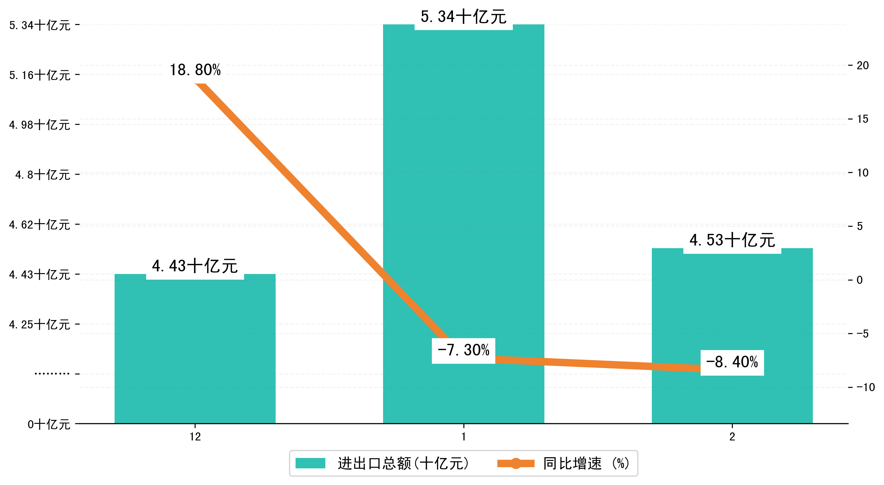 以人民币计,2023年2月甘肃省进出口总额为45,2880.825万元,相比上月减少了8,1323.5486万元;相比上年同期减少了2,1018.3301万元,同比减少了-8.40%。