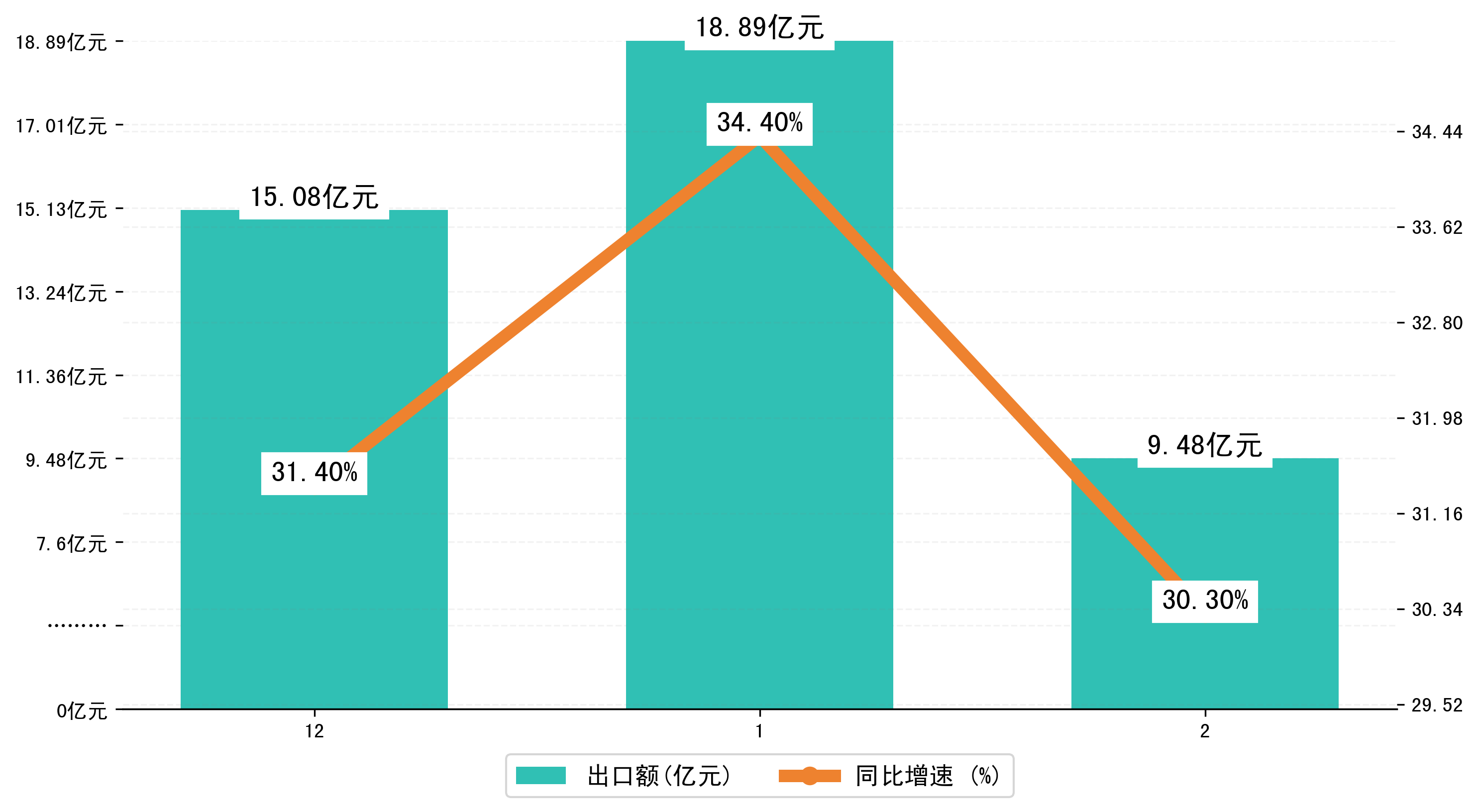 以人民币计,2023年2月甘肃省出口额为9,4786.221万元,相比上月减少了9,4135.0621万元;相比上年同期增加了1,6371.134万元,同比增加了30.30%。