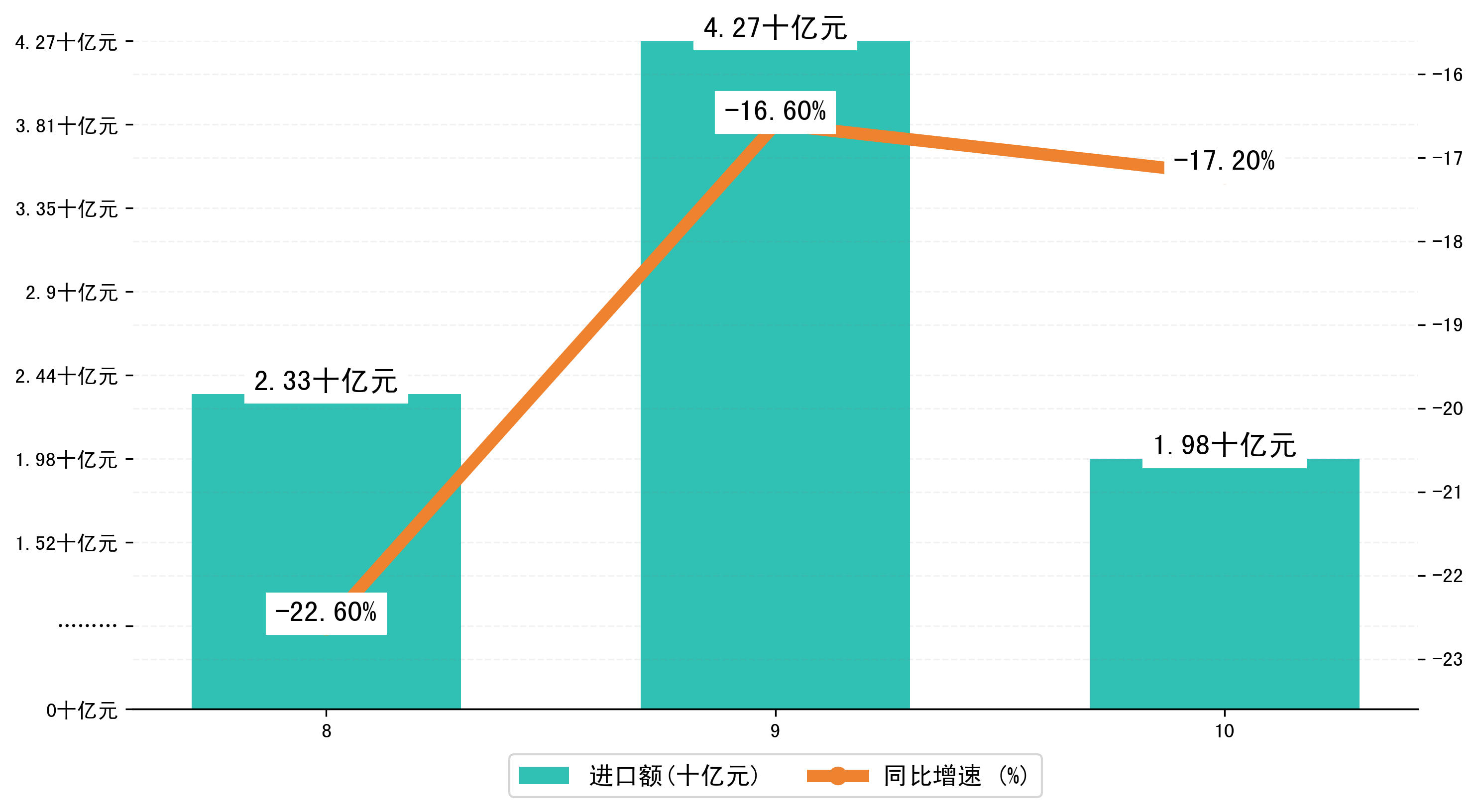 以人民币计,2023年10月甘肃省进口额为19,7938.4459万元,相比上月减少了22,9060.5338万元;相比上年同期减少了4,5537.5369万元,同比减少了-17.20%。