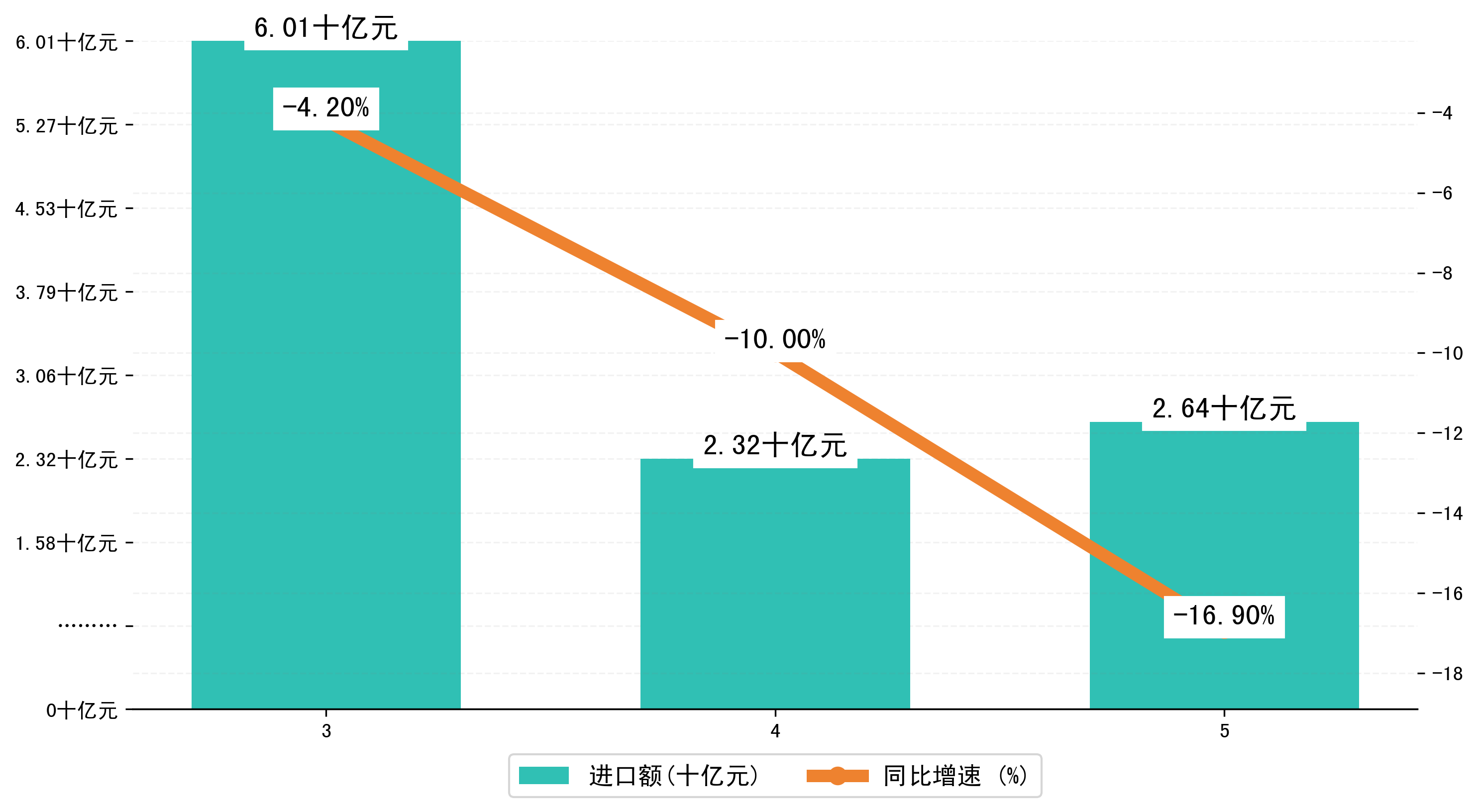 以人民币计,2023年1-5月甘肃省进口额为180,7946.3547万元,相比上年同期减少了40,5218.1022万元,同比减少了-16.90%。