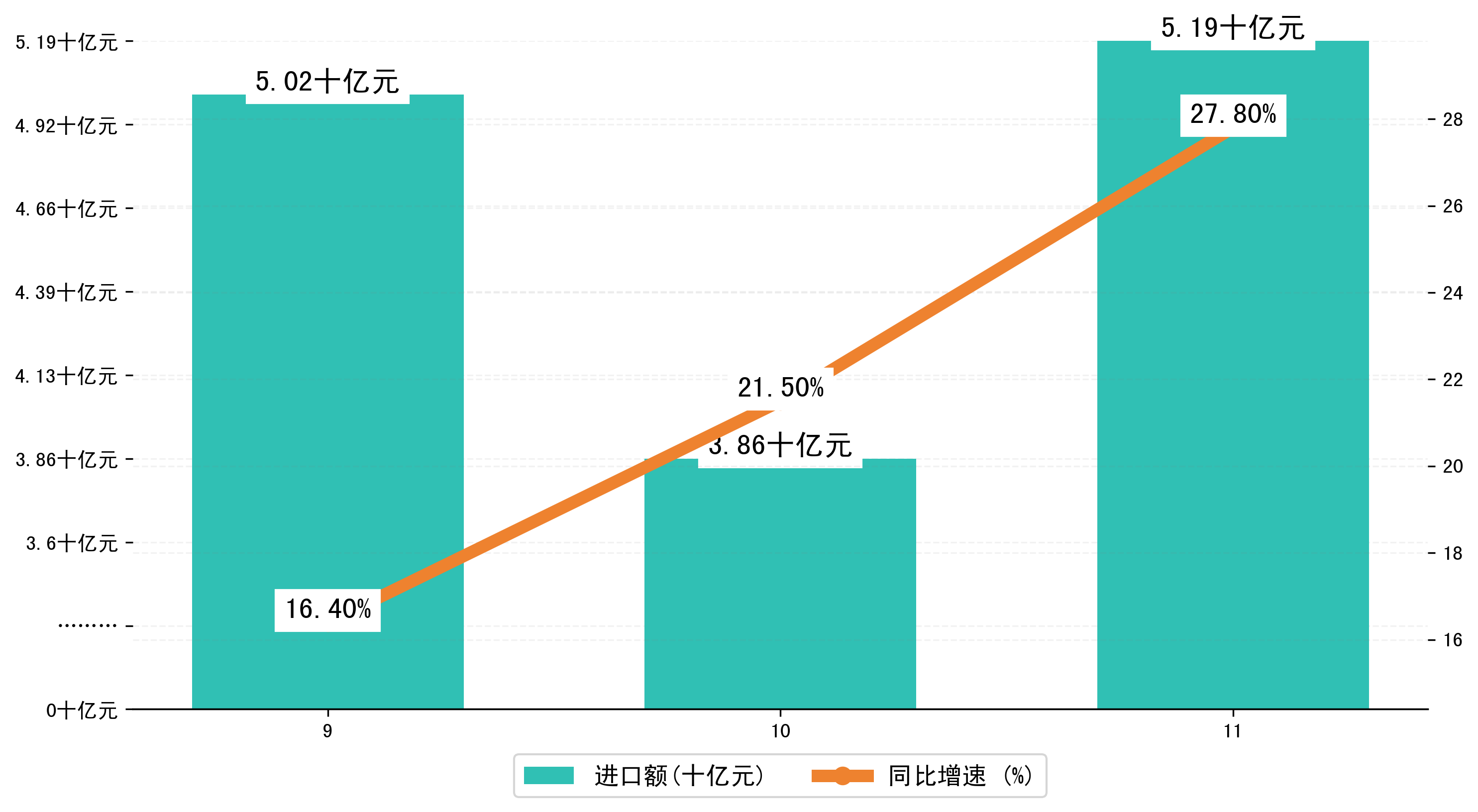 以人民币计,2024年11月甘肃省进口额为51,9021.7862万元,相比上月增加了13,2822.2331万元;相比上年同期增加了25,9051.7513万元,同比增加了27.80%。