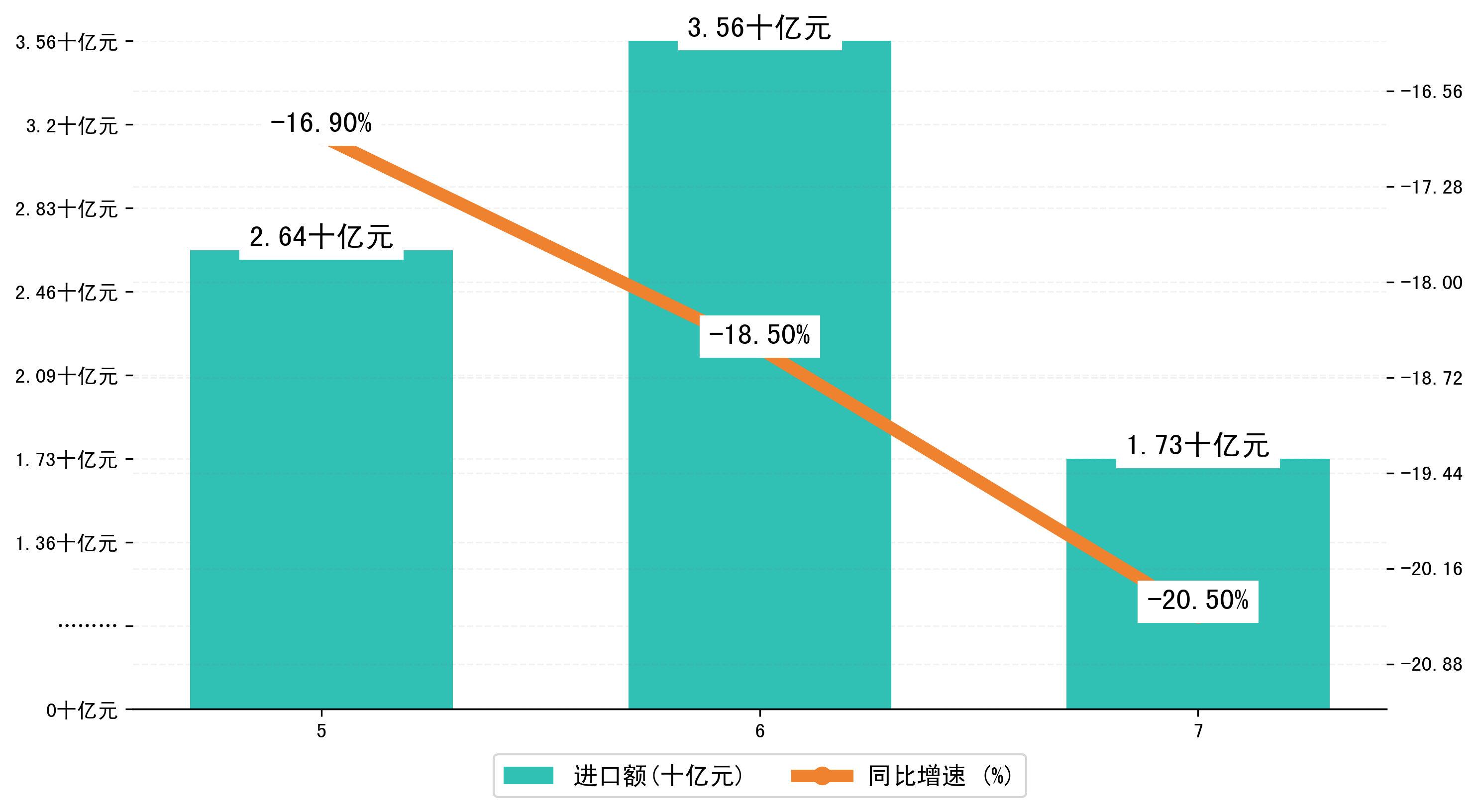 以人民币计,2023年7月甘肃省进口额为17,2734.1863万元,相比上月减少了18,3463.3853万元;相比上年同期减少了14,7863.6177万元,同比减少了-20.50%。