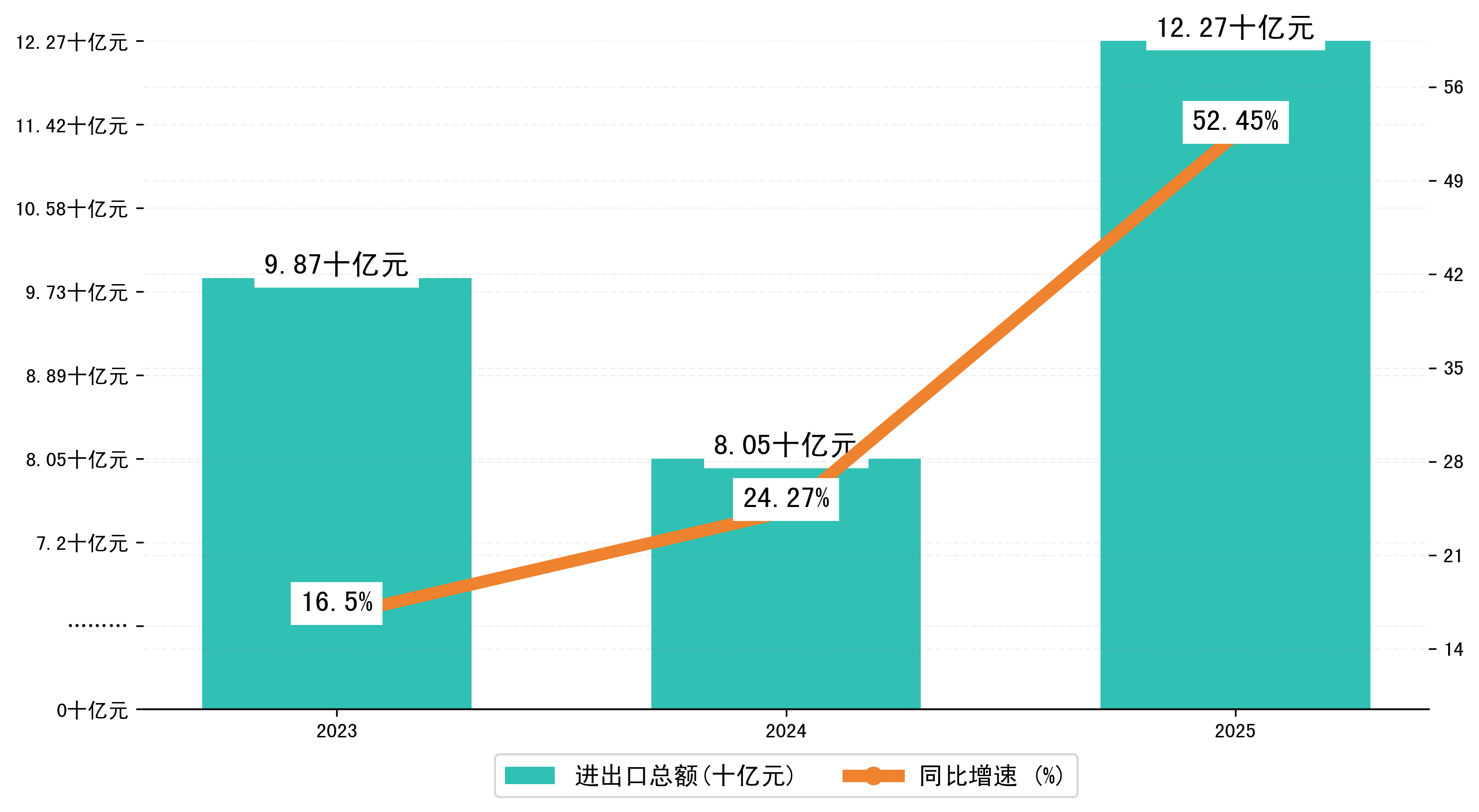 以人民币计,2025年1-2月甘肃省进出口总额为122,6665.514万元,相比上年同期增加了42,2008.093万元,同比增加了54.60%。