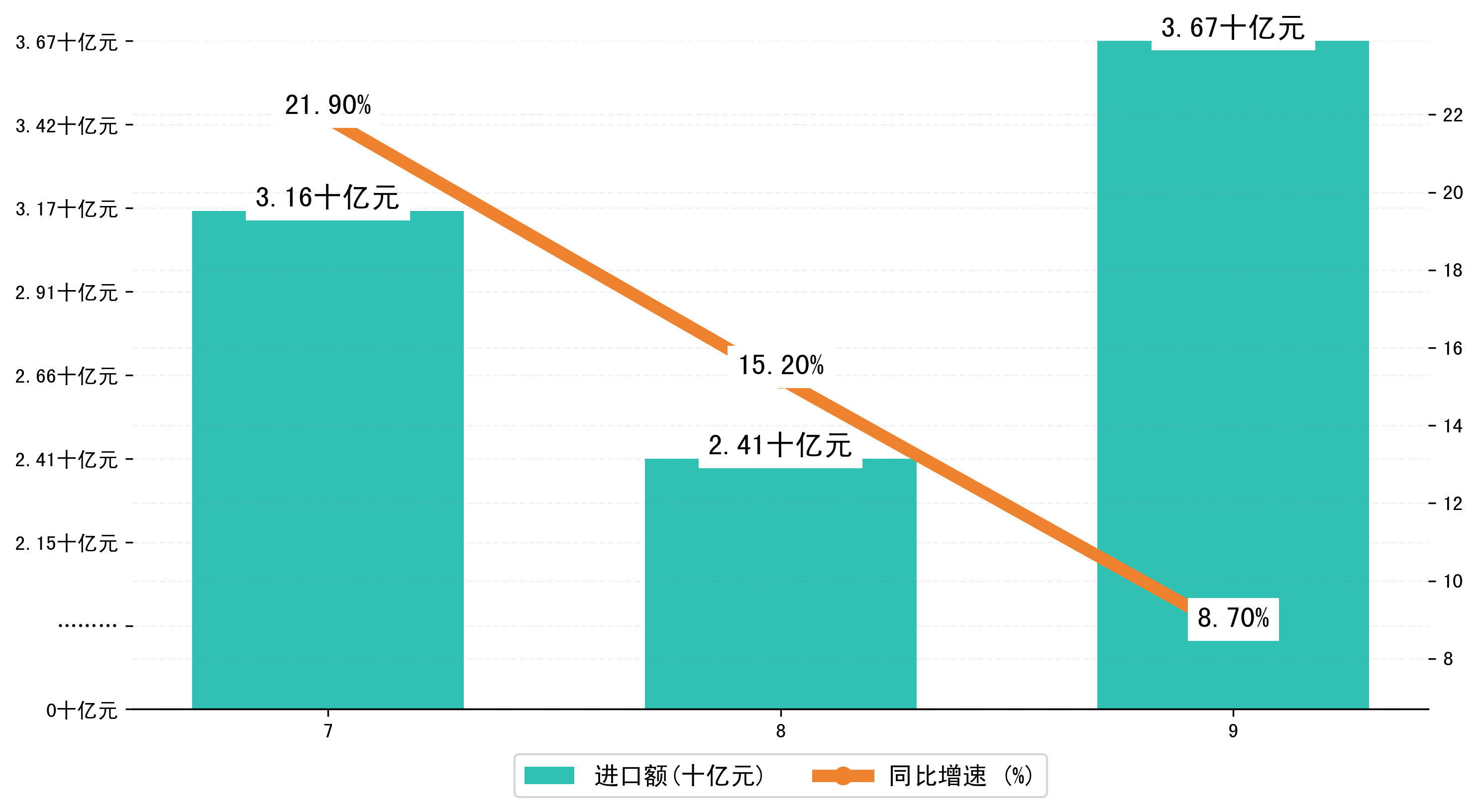 以人民币计,2025年1-9月甘肃省进口额为360,9231.5675万元,相比上年同期增加了27,3711.0721万元,同比增加了8.70%。