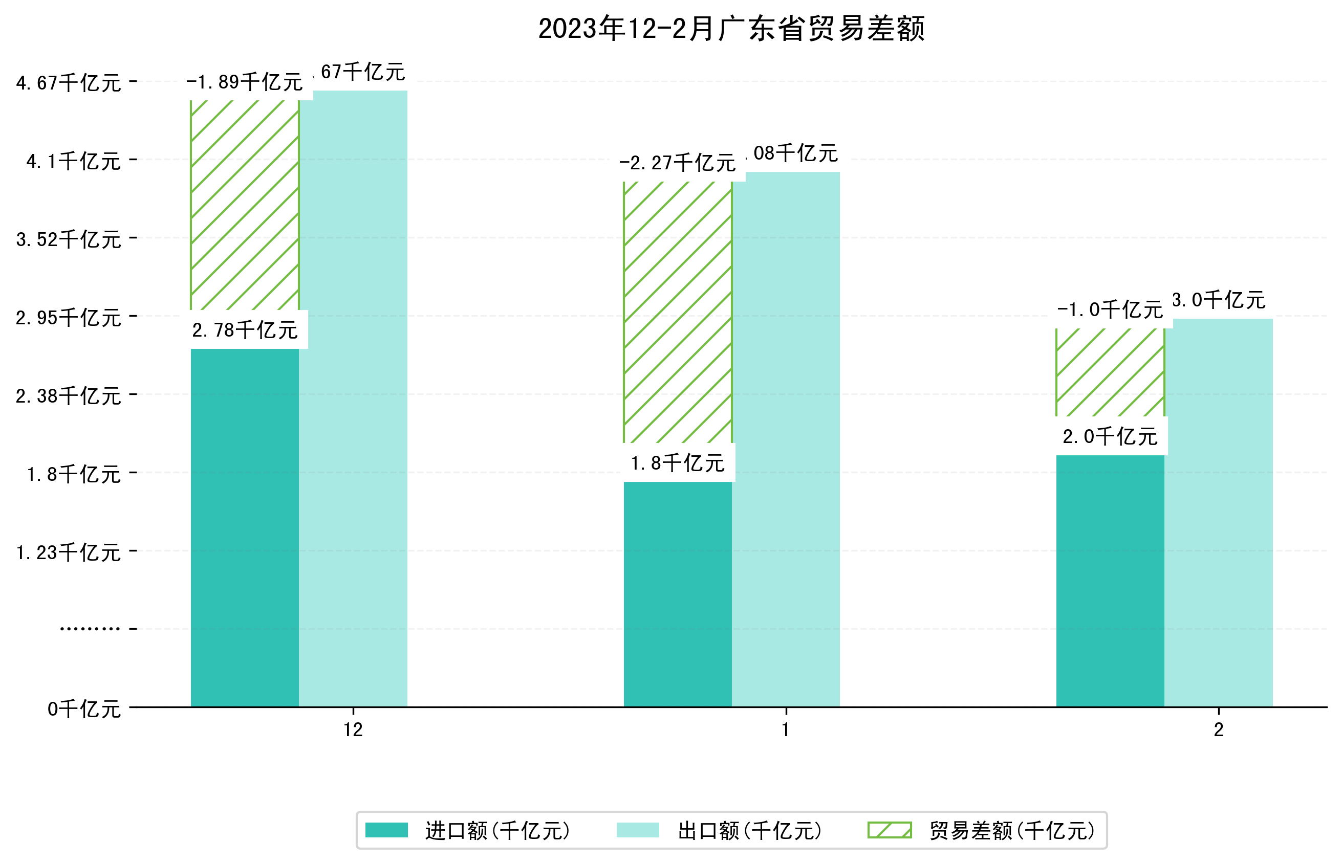 以美元计,2023年1-2月广东省贸易差额为473,8043,2607万美元(贸易顺差),相比上年同期减少了58,2858,4587万美元,同比减少-10.95%。