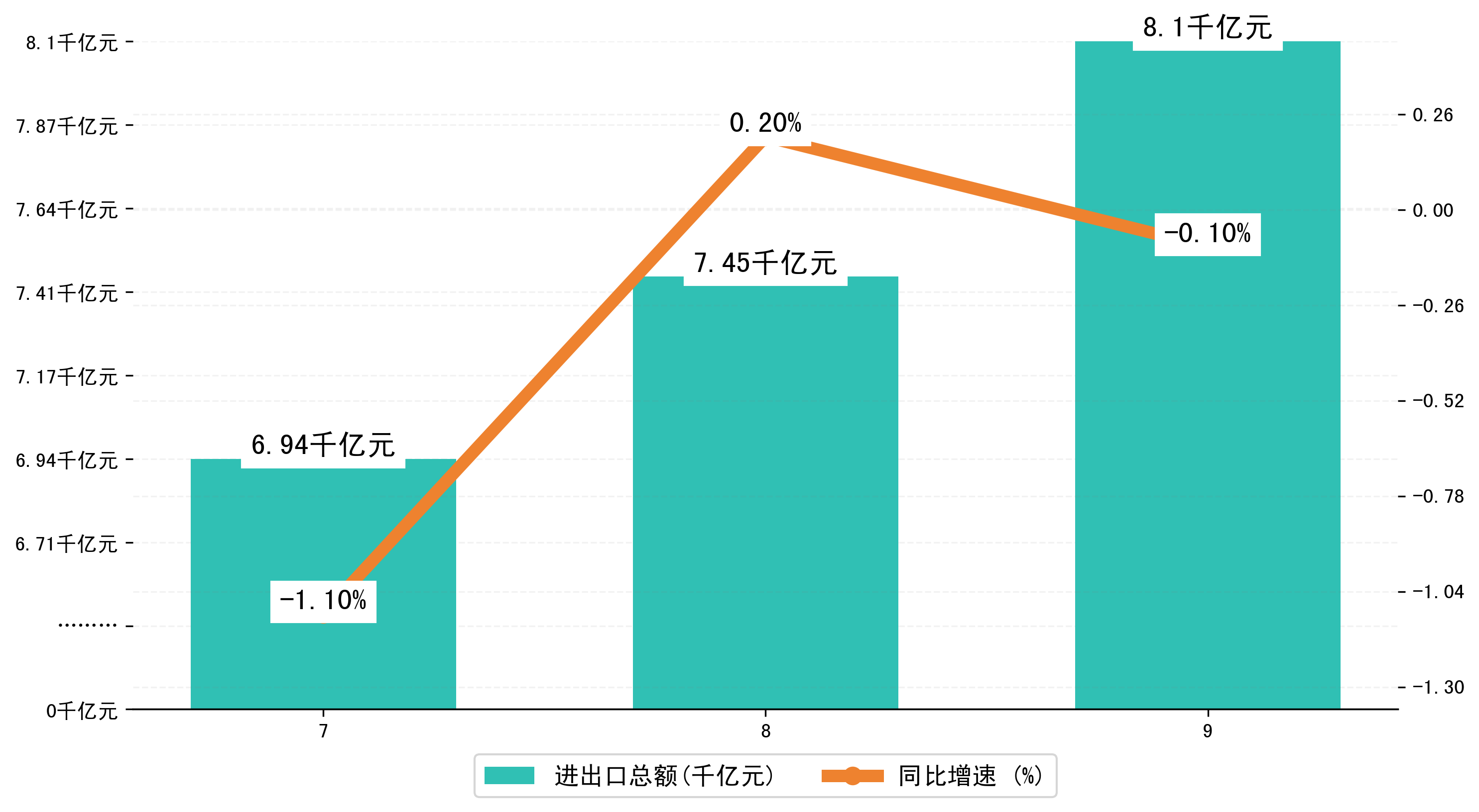 以人民币计,2023年9月广东省进出口总额为8098,3618.665万元,相比上月增加了651,4407.0071万元;相比上年同期减少了194,9400.4382万元,同比减少了-0.10%。