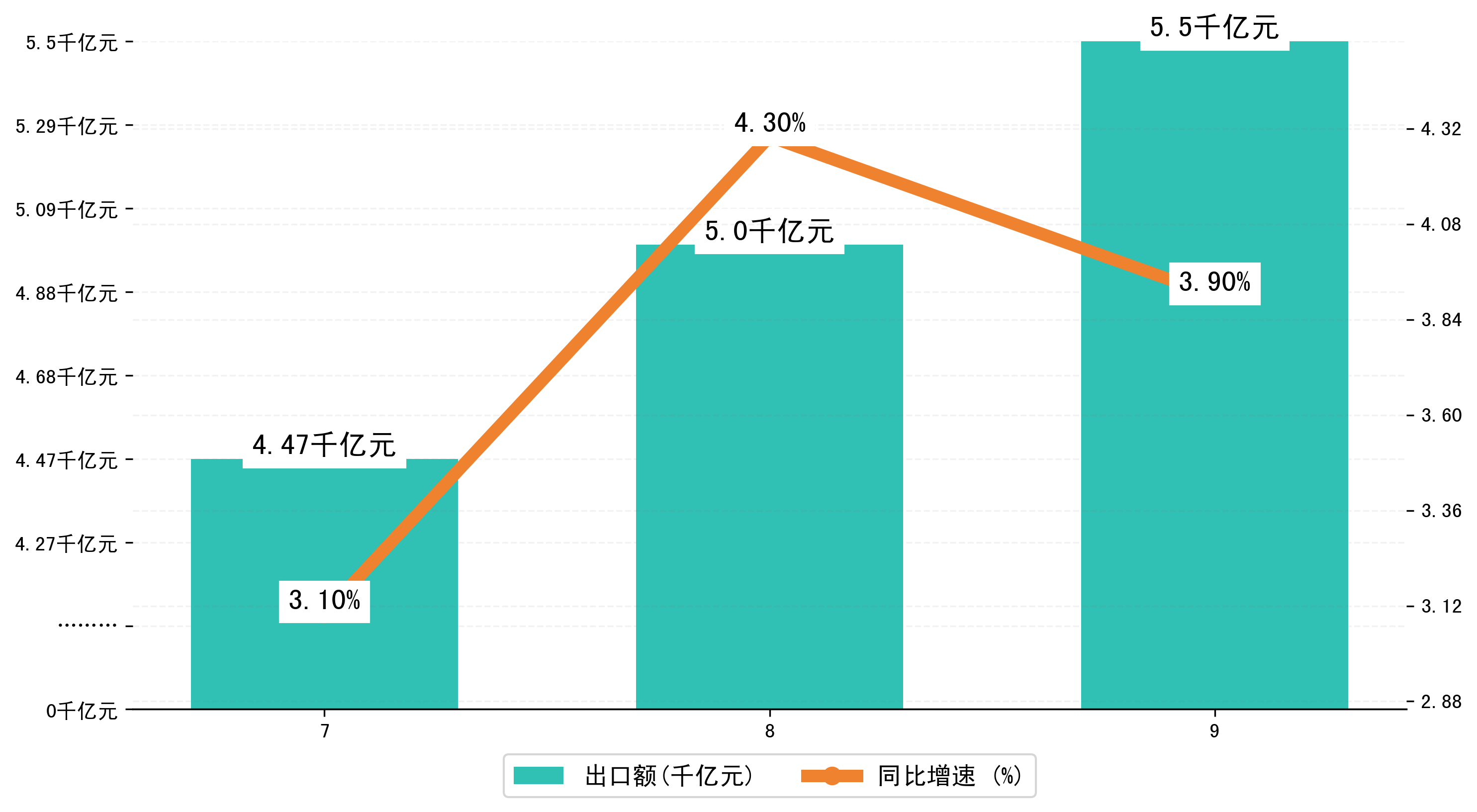 以人民币计,2023年9月广东省出口额为5495,3639.0834万元,相比上月增加了498,7153.1374万元;相比上年同期增加了36,6537.1379万元,同比增加了3.90%。