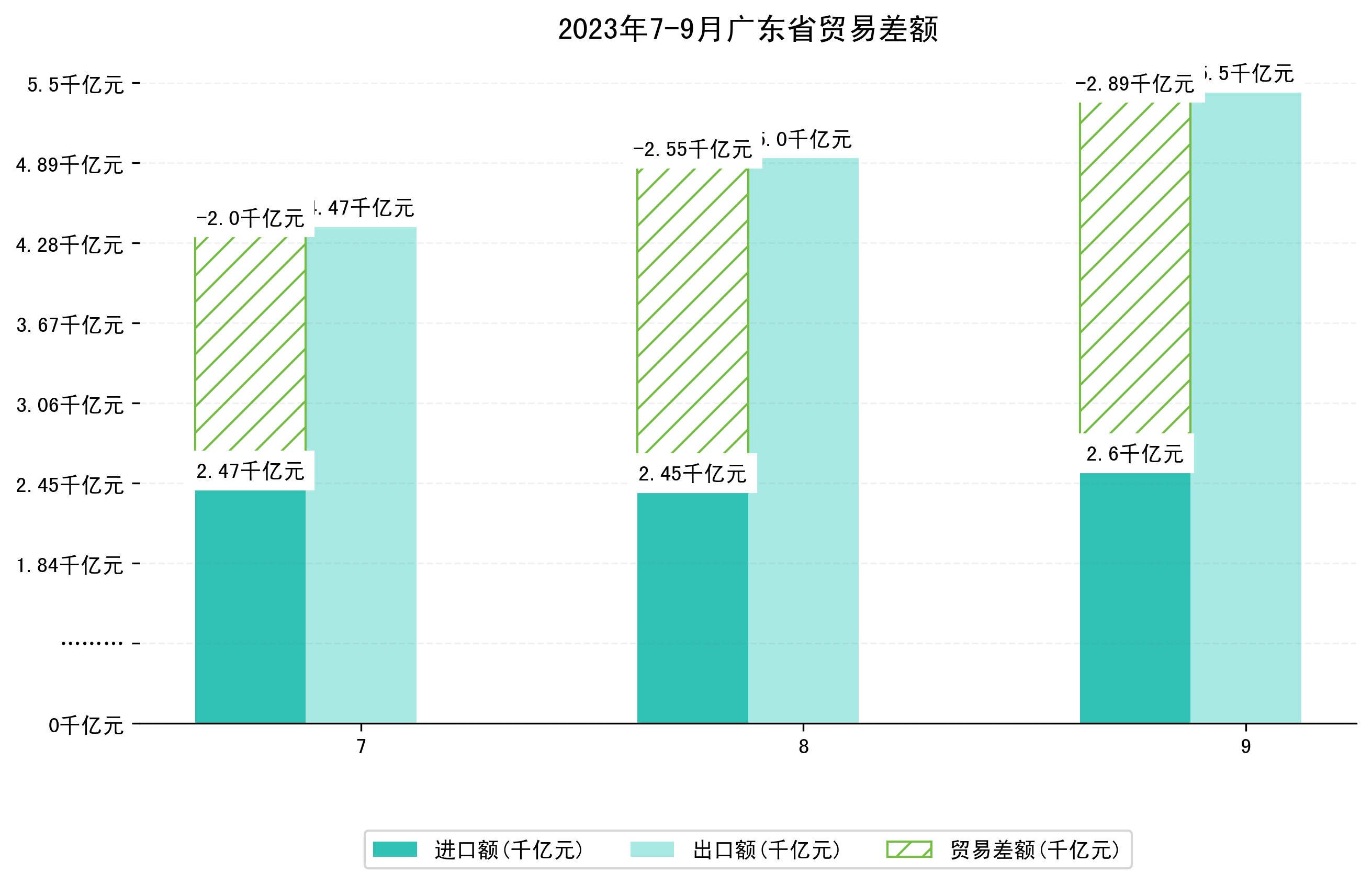 以人民币计,2023年1-9月广东省贸易差额为1,9859,3277,9278万元(贸易顺差),相比上年同期增加了3143,3822,0727万元,同比增加18.8%。
