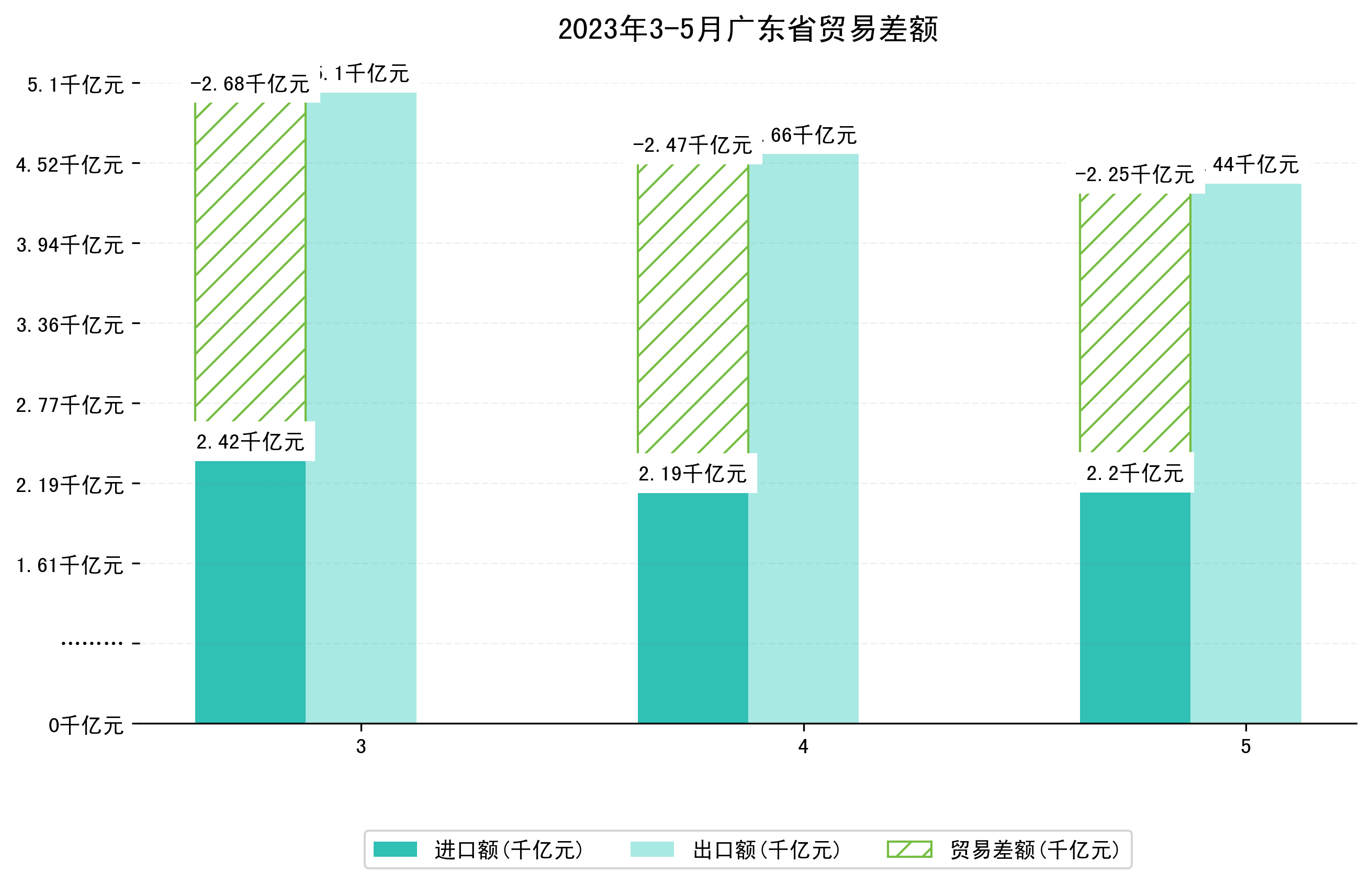 以人民币计,2023年5月广东省贸易差额为2246,9174,2133万元(贸易顺差),相比上月减少了220,3070,5213万元,即32,6881,1152万美元;相比上年同期增加了311,2616,5367万元,同比增加16.08%。