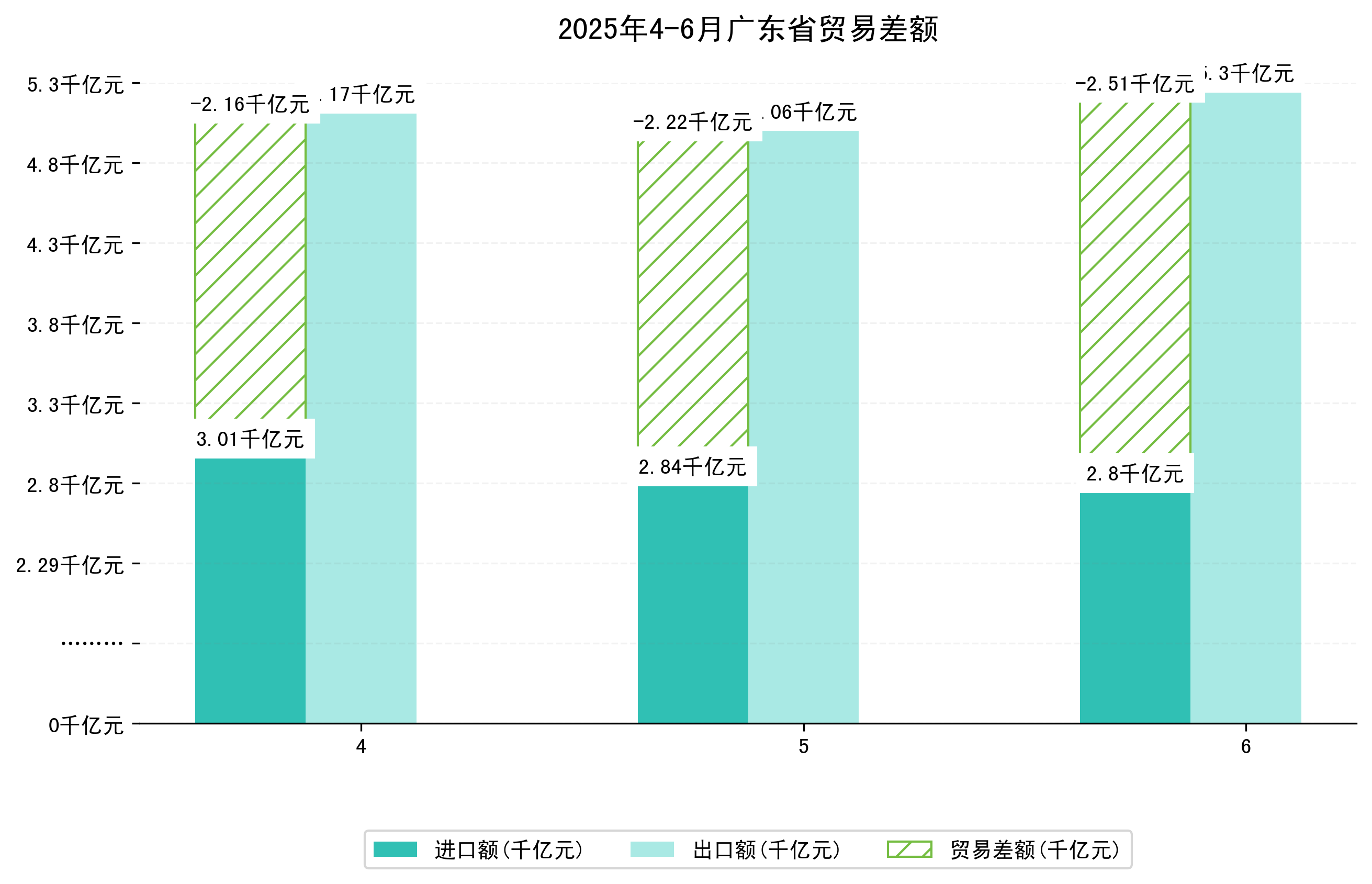 以人民币计,2025年6月广东省贸易差额为2508,0238,0768万元(贸易顺差),相比上月增加了283,1916,7038万元,即39,5546,6847万美元;相比上年同期减少了71,8095,1006万元,同比减少-2.78%。