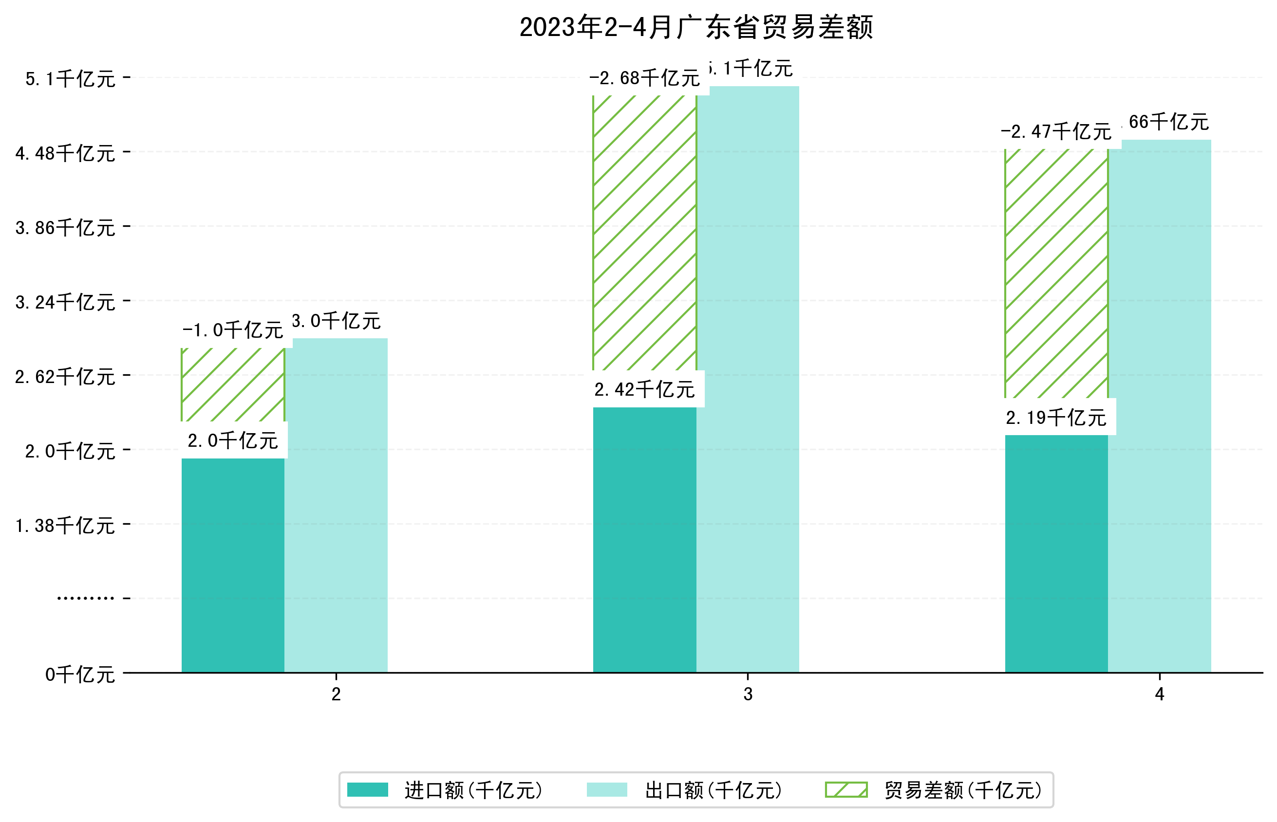 以人民币计,2023年4月广东省贸易差额为2467,2244,7346万元(贸易顺差),相比上月减少了213,2477,4645万元,即33,3240,0068万美元;相比上年同期增加了474,3521,9847万元,同比增加23.8%。