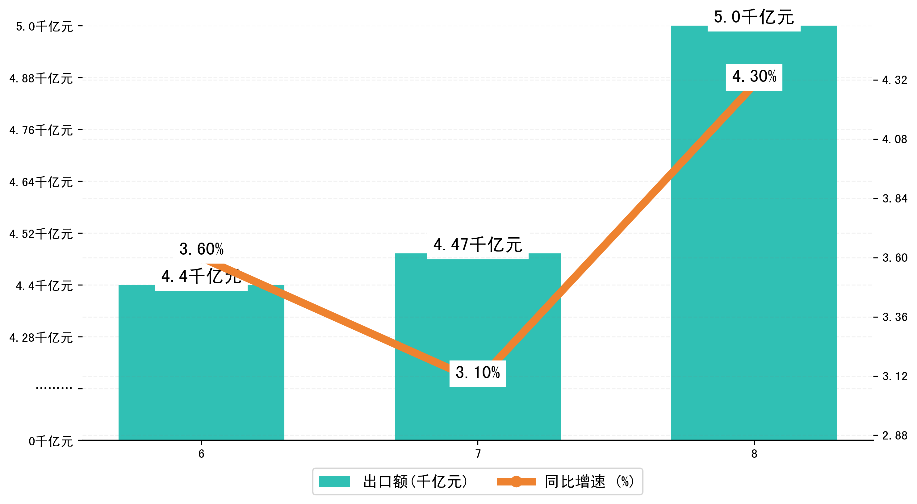 以人民币计,2023年1-8月广东省出口额为3,4944,7102.6723万元,相比上年同期增加了1532,1310.3141万元,同比增加了4.30%。