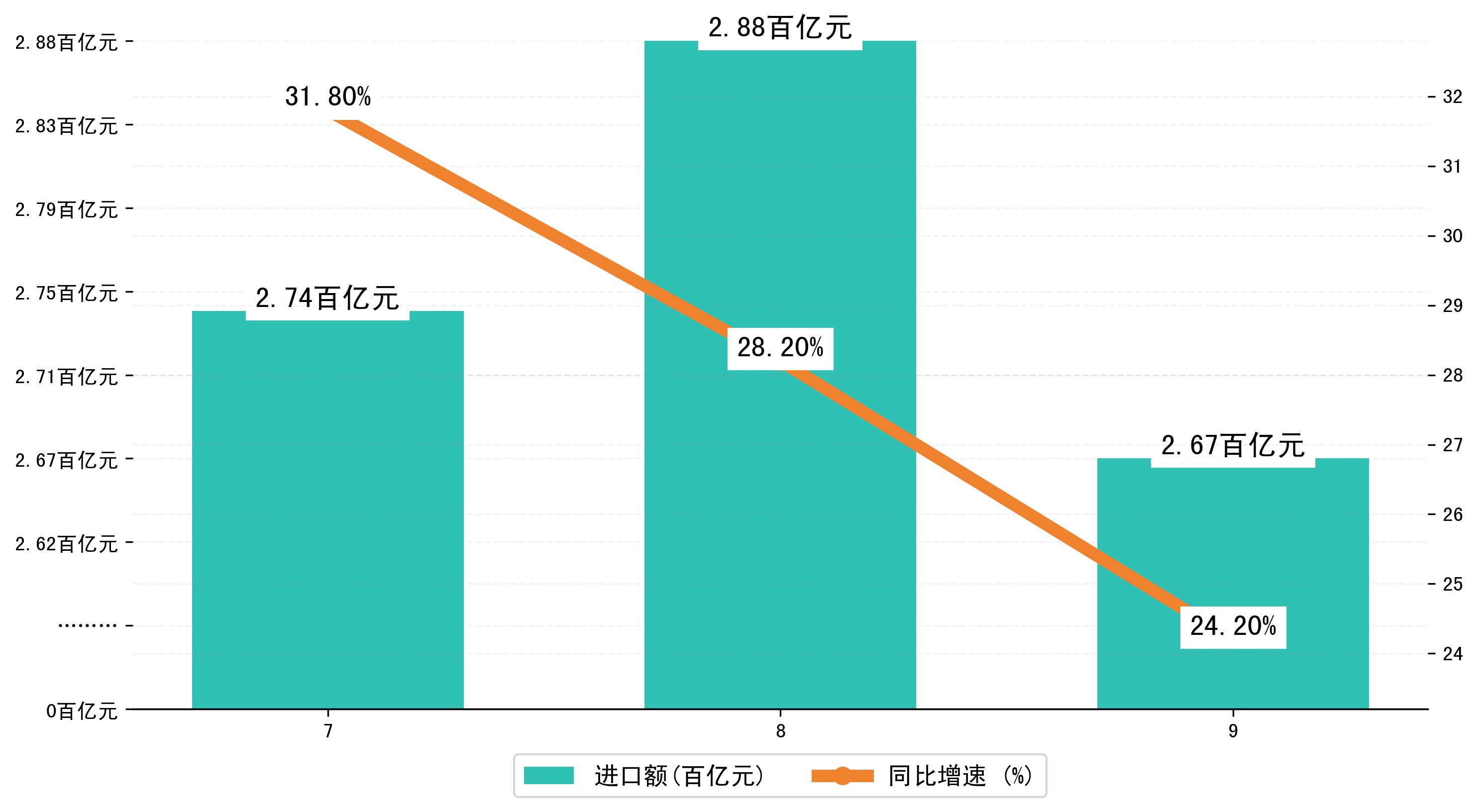 以人民币计,2023年1-9月广西壮族自治区进口额为2508,4580.8514万元,相比上年同期增加了446,0769.1242万元,同比增加了24.20%。