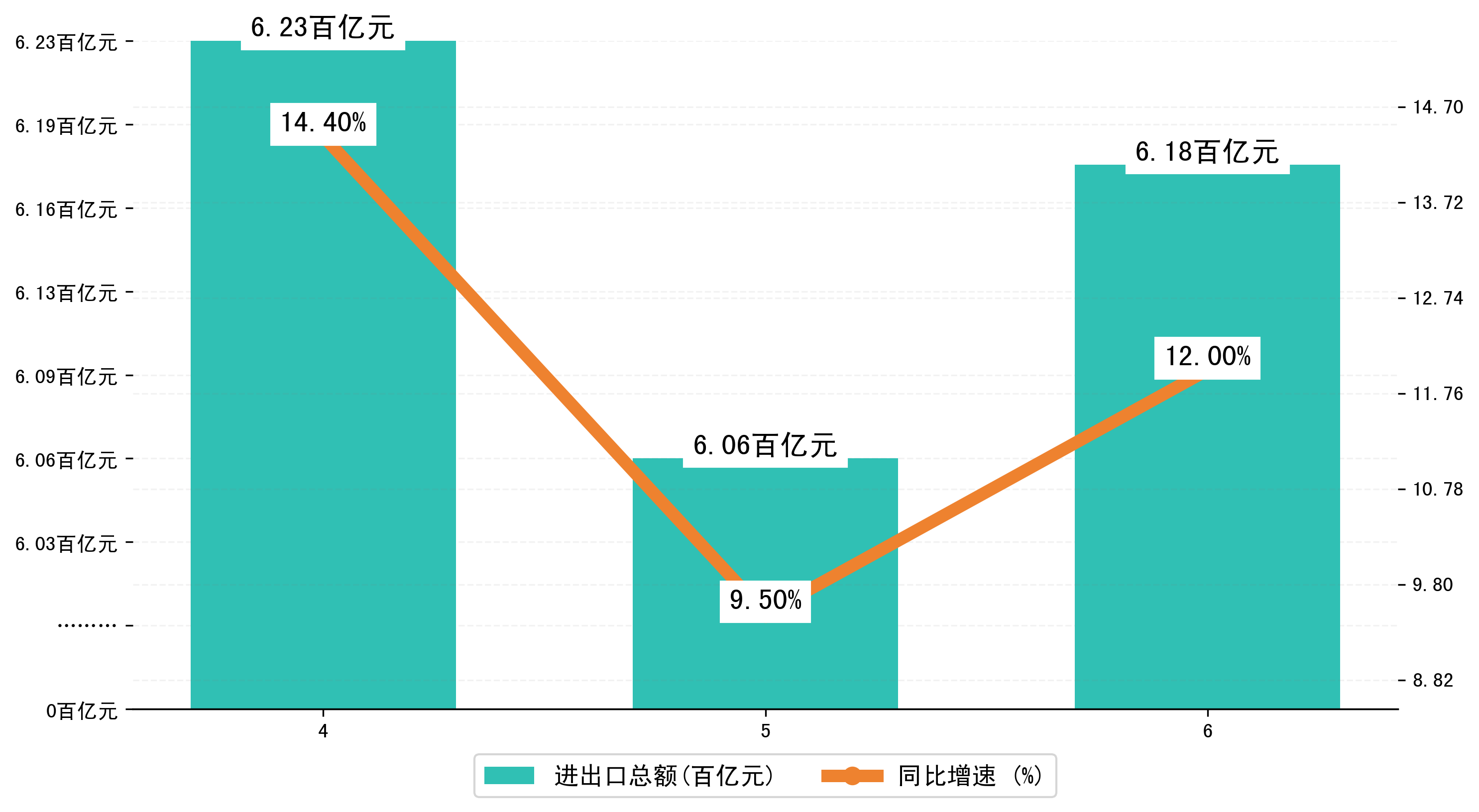 以人民币计,2024年6月广西壮族自治区进出口总额为617,6902.0173万元,相比上月增加了11,6027.0186万元;相比上年同期增加了67,9436.9221万元,同比增加了12.00%。