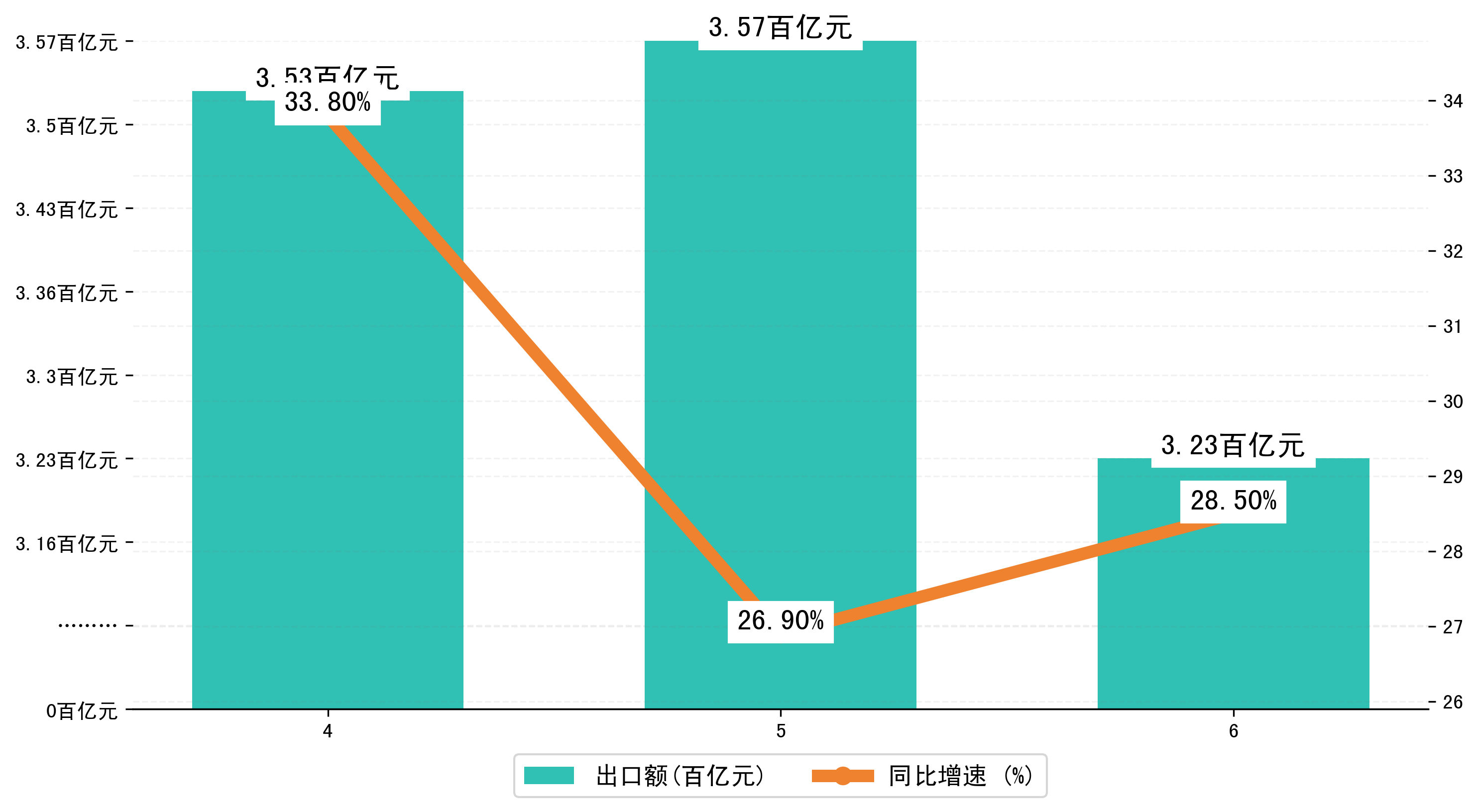 以人民币计,2024年6月广西壮族自治区出口额为322,7313.4661万元,相比上月减少了34,4035.2045万元;相比上年同期增加了62,0129.3576万元,同比增加了28.50%。