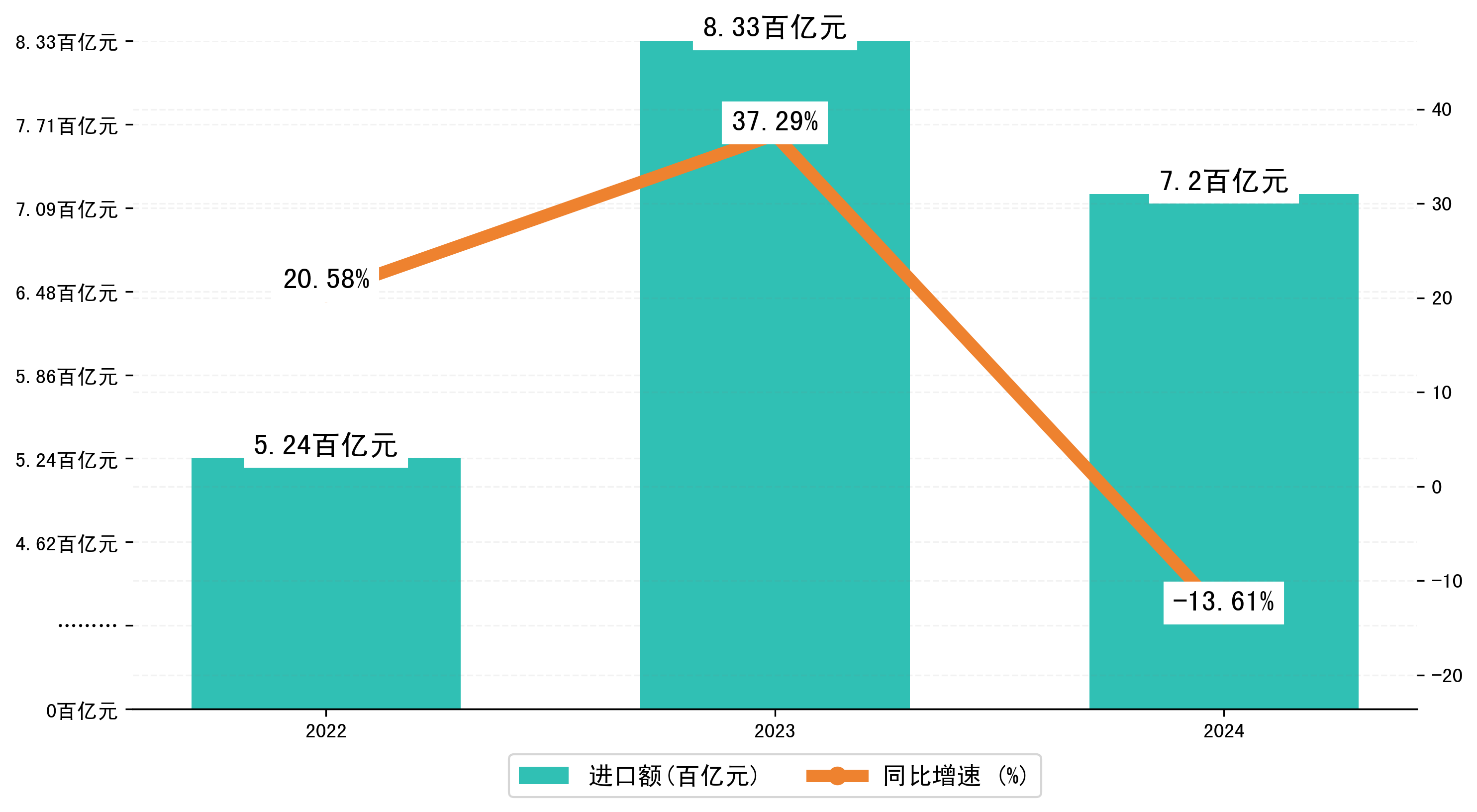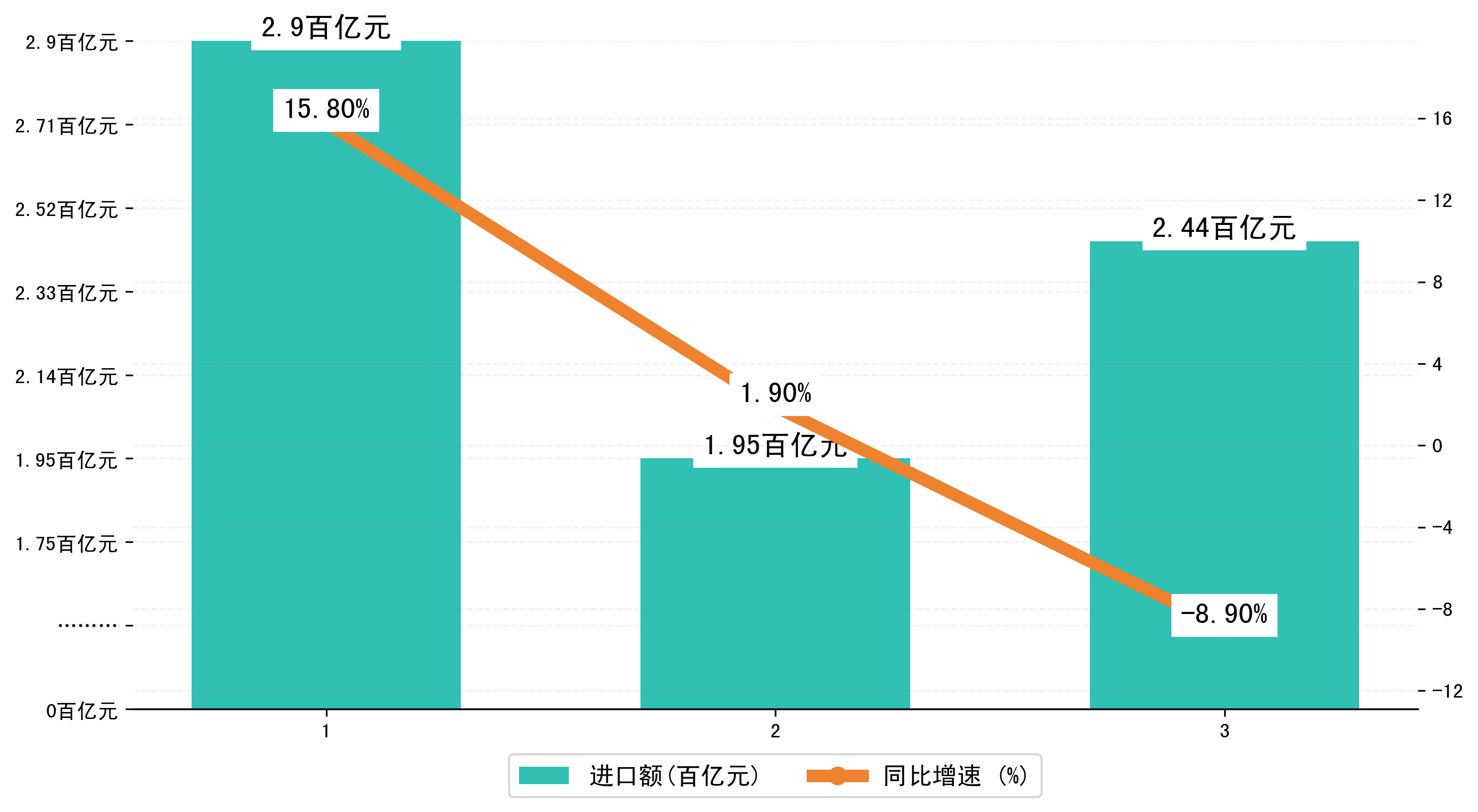 以人民币计,2024年3月广西壮族自治区进口额为244,4949.8496万元,相比上月增加了49,8713.0119万元;相比上年同期减少了91,8945.98万元,同比减少了-8.90%。