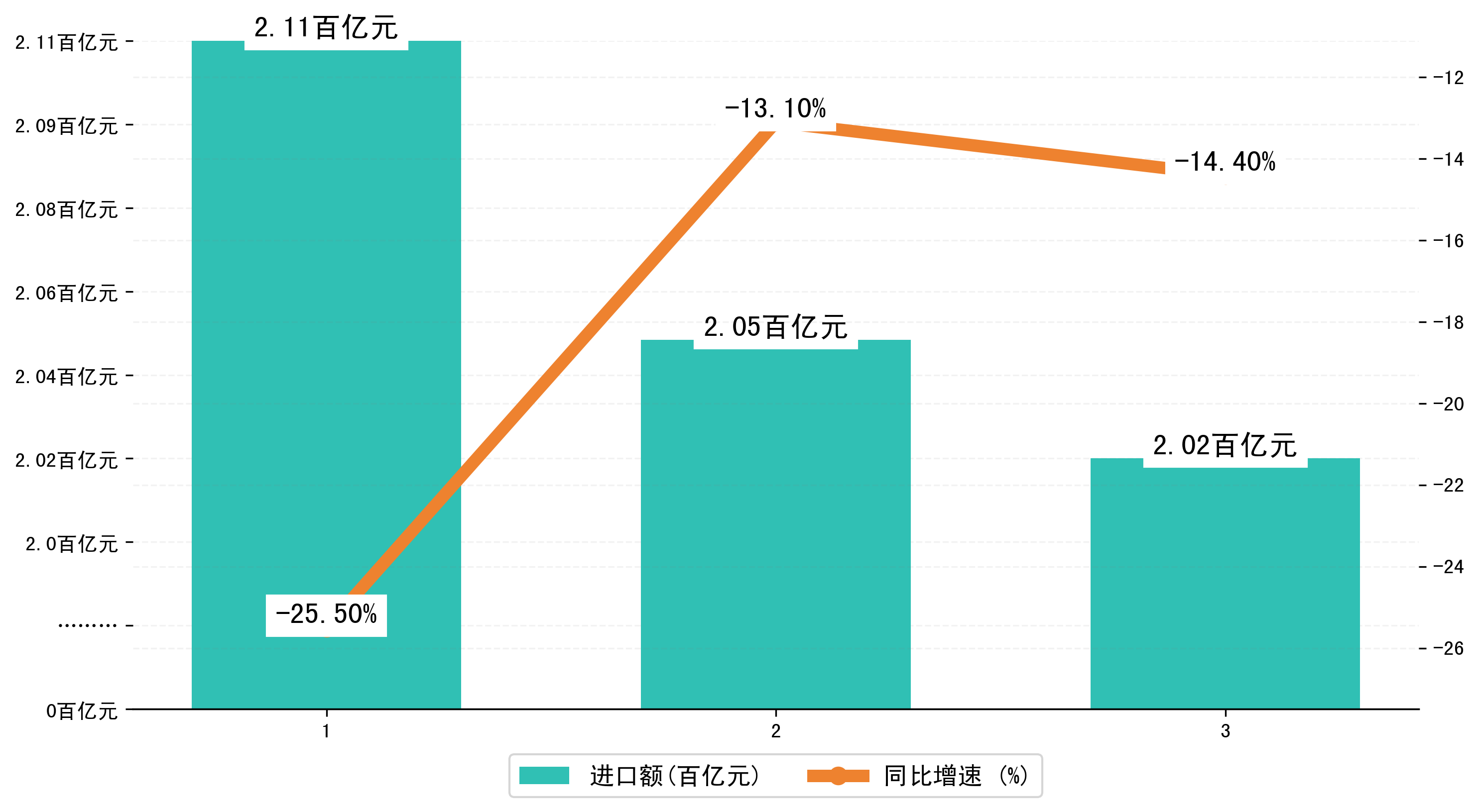 以美元计,2025年1-3月广西壮族自治区进口额为86,0331.1956万美元,相比上年同期减少了15,2084.4087万美元,同比减少-15.30%。