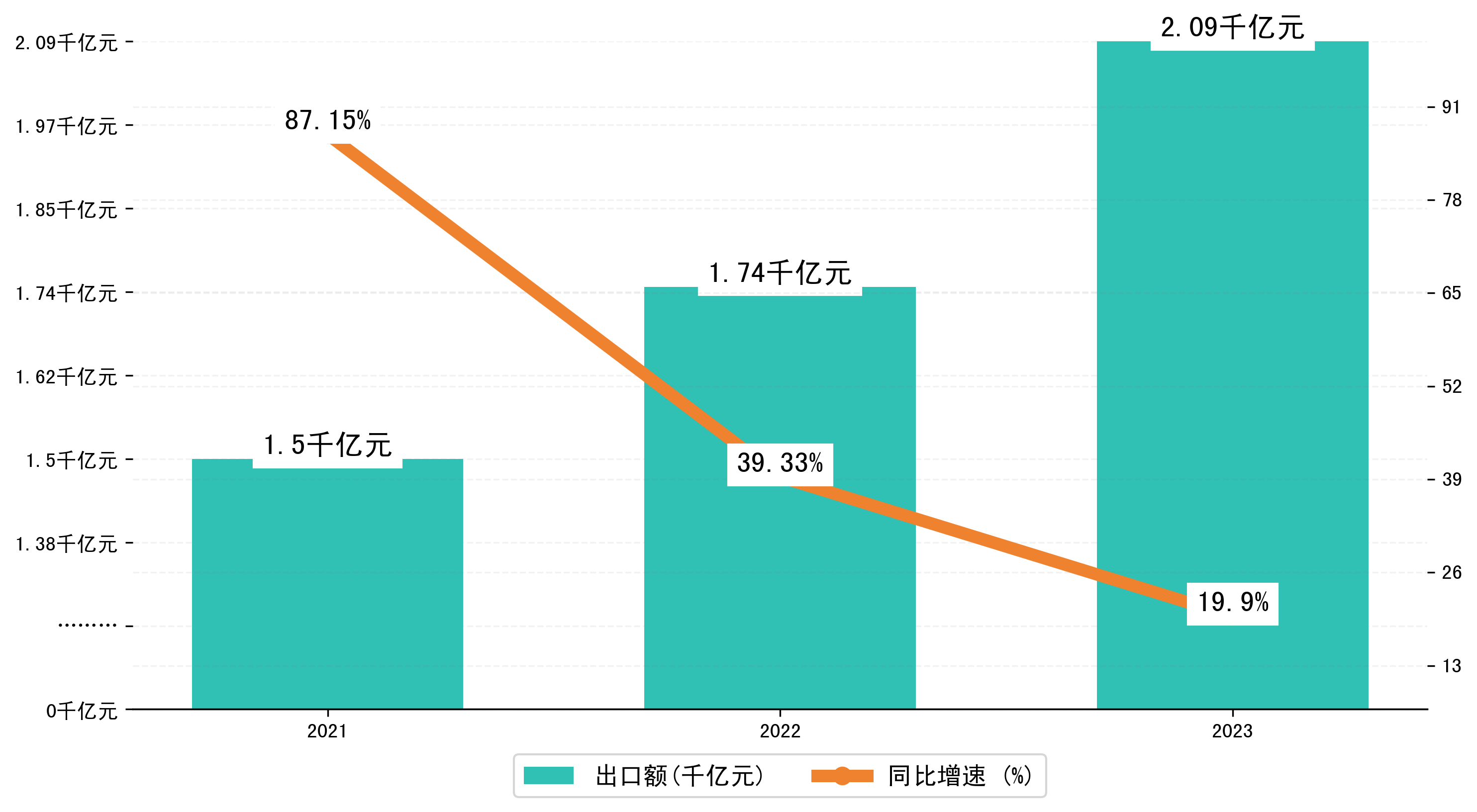 以人民币计,2023年1-5月安徽省出口额为2089,2406.8726万元,相比上年同期增加了346,7396.0389万元,同比增加了20.00%。