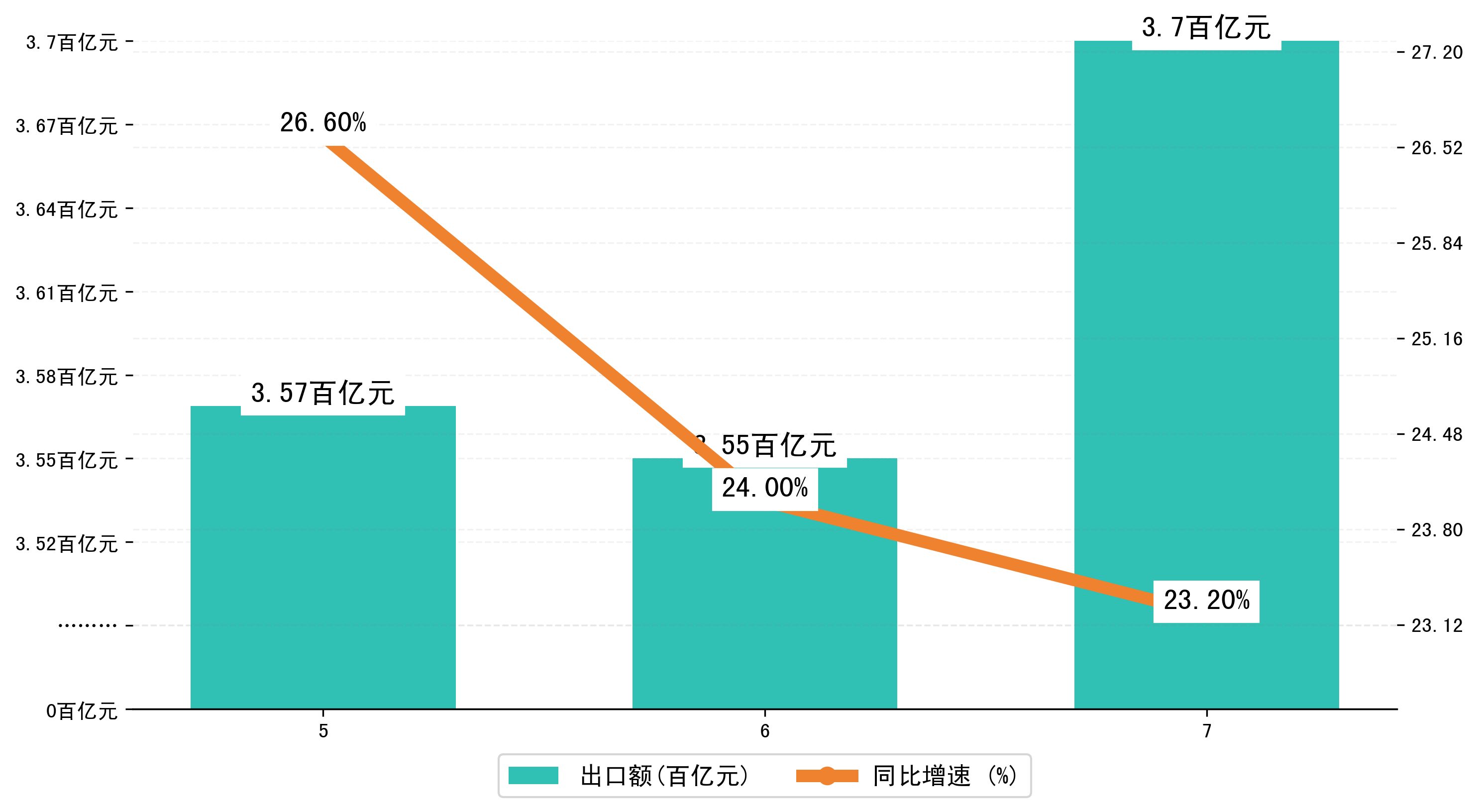 以人民币计,2025年7月广西壮族自治区出口额为370,0910.0048万元,相比上月增加了14,9588.5439万元;相比上年同期增加了55,3289.2791万元,同比增加了23.20%。